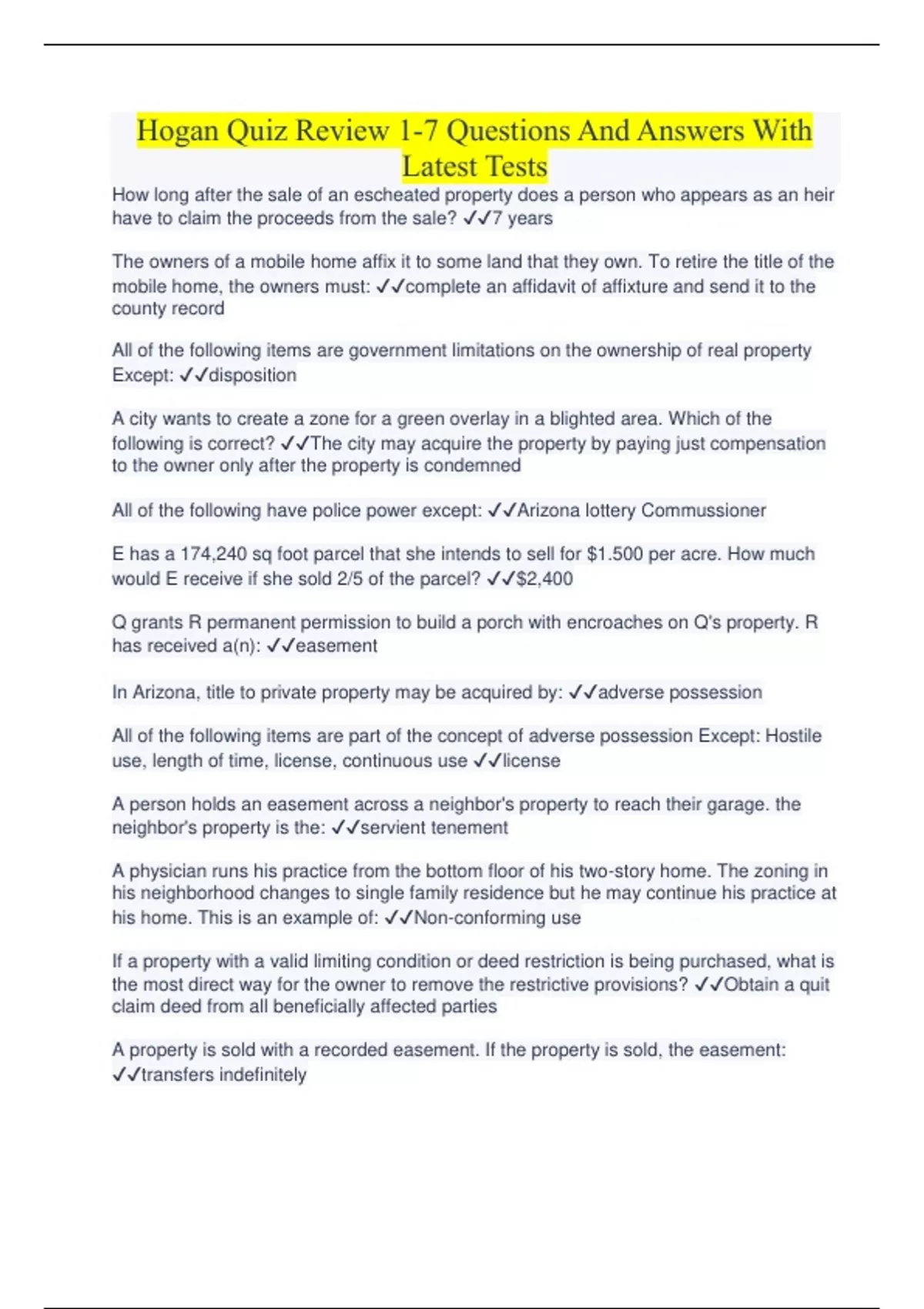 Hogan Quiz Review 1-7 Questions And Answers With Latest Tests How long after the sale of an escheated property does a person who appears as an heir have to claim the proceeds from the sale? 7 years The owners of a mobile home affix it to some land that they own. To retire the title of the mobile home, the owners must: complete an affidavit of affixture and send it to the county record All of the following items are government limitations on the ownership of real property Except: disposition A city wants to create a zone for a green overlay in a blighted area. Which of the following is correct? The city may acquire the property by paying just compensation to the owner only after the property is condemned