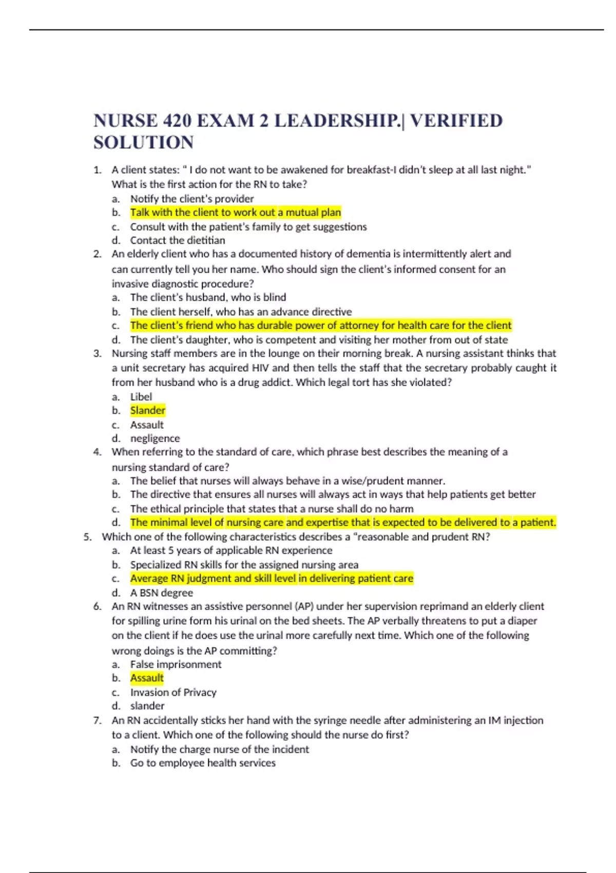 NURSE 420 EXAM 2 LEADERSHIP.| VERIFIED SOLUTION A client states: “ I do not want to be awakened for breakfast-I didn’t sleep at all last night.” What is the first action for the RN to take? Notify the client’s provider Talk with the client to work out a mutual plan Consult with the patient’s family to get suggestions Contact the dietitian An elderly client who has a documented history of dementia is intermittently alert and can currently tell you her name. Who should sign the client’s informed consent for an invasive diagnostic procedure? The client’s husband, who is blind The client herself, who has an advance directive The client’s friend who has durable power of attorney for health care for the client The client’s daughter, who is competent and visiting her mother from out of state Nursing staff members are in the lounge on their morning break. A nursing assistant thinks that a unit secretary has acquired HIV and then tells the staff that the secretary probably caught it from her husband who is a drug addict. Which legal tort has she violated? Libel Slander Assault negligence When referring to the standard of care, which phrase best describes the meaning of a nursing standard of care? The belief that nurses will always behave in a wise/prudent manner. The directive that ensures all nurses will always act in ways that help patients get better The ethical principle that states that a nurse shall do no harm The minimal level of nursing care and expertise that is expected to be delivered to a patient. Which one of the following characteristics describes a “reasonable and prudent RN? At least 5 years of applicable RN experience Specialized RN skills for the assigned nursing area Average RN judgment and skill level in delivering patient care A BSN degree An RN witnesses an assistive personnel (AP) under her supervision reprimand an elderly client for spilling urine form his urinal on the bed sheets. The AP verbally threatens to put a diaper on the client if he does use the urinal more carefully next time. Which one of the following wrong doings is the AP committing? False imprisonment Assault Invasion of Privacy slander An RN accidentally sticks her hand with the syringe needle after administering an IM injection to a client. Which one of the following should the nurse do fir