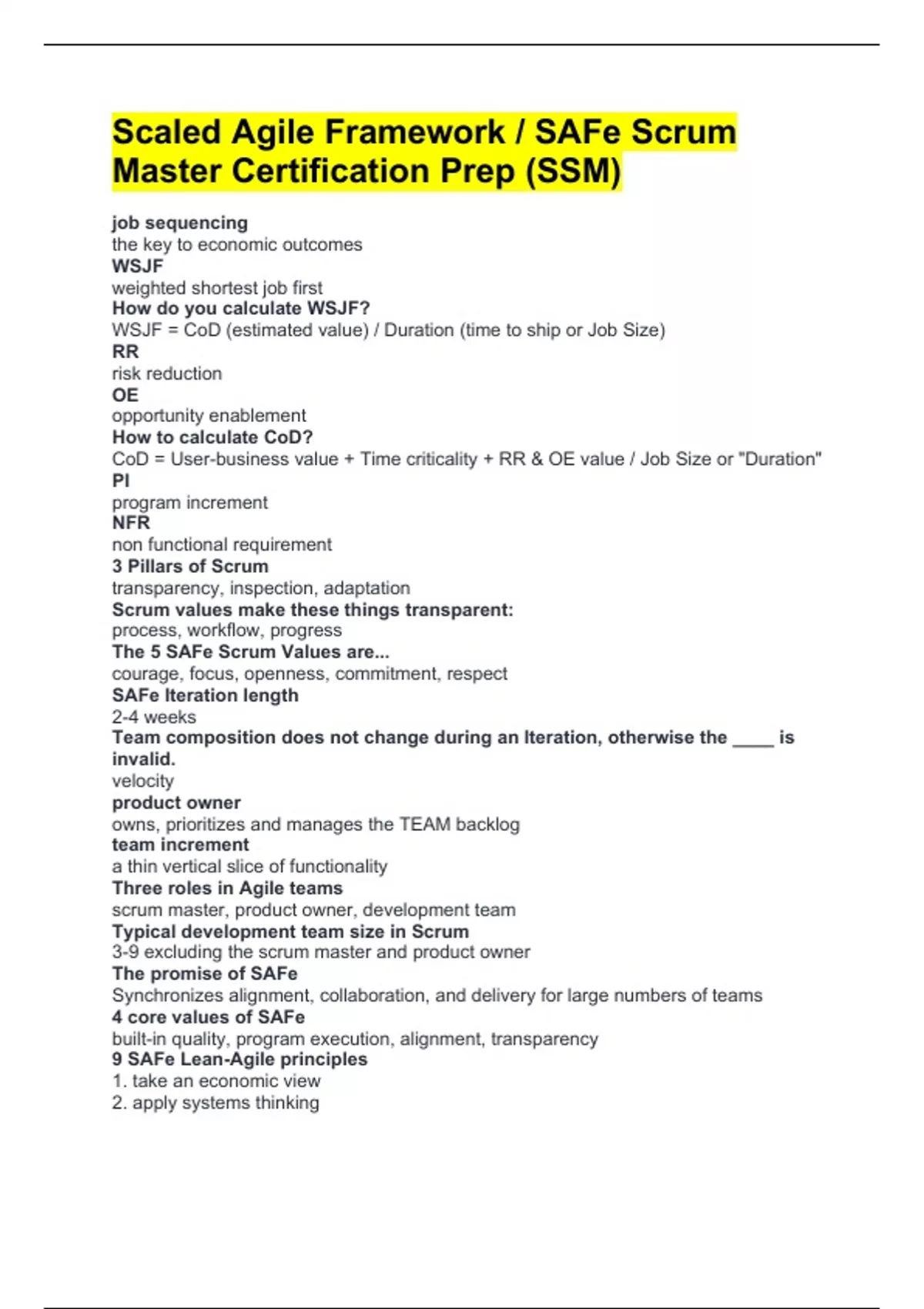 Scaled Agile Framework / SAFe Scrum Master Certification Prep (SSM) job sequencing the key to economic outcomes WSJF weighted shortest job first How do you calculate WSJF? WSJF = CoD (estimated value) / Duration (time to ship or Job Size) RR risk reduction OE opportunity enablement How to calculate CoD? CoD = User-business value + Time criticality + RR & OE value / Job Size or "Duration" PI program increment NFR non functional requirement 3 Pillars of Scrum transparency, inspection, adaptation Scrum values make these things transparent: process, workflow, progress The 5 SAFe Scrum Values are... courage, focus, openness, commitment, respect SAFe Iteration length 2-4 weeks Team composition does not change during an Iteration, otherwise the ____ is invalid. velocity product owner owns, prioritizes and manages the TEAM backlog team increment a thin vertical slice of functionality Three roles in Agile teams scrum master, product owner, development team Typical development team size in Scrum 3-9 excluding the scrum master and product owner The promise of SAFe Synchronizes alignment, collaboration, and delivery for large numbers of teams 4 core values of SAFe built-in quality, program execution, alignment, transparency 9 SAFe Lean-Agile principles 1. take an economic view 2. apply systems thinking