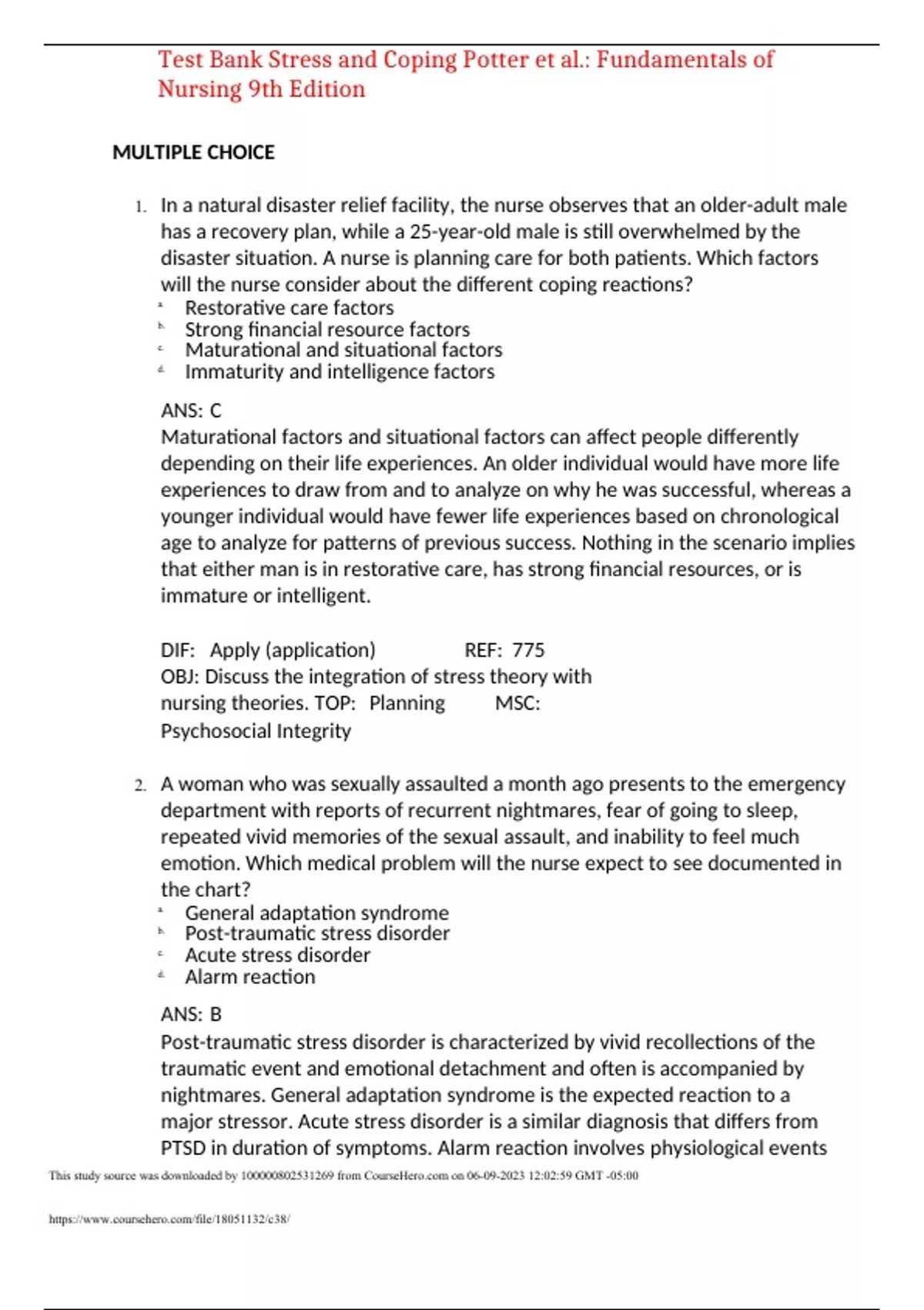 Test Bank Stress and Coping Potter et al.: Fundamentals of Nursing 9th Edition MULTIPLE CHOICE 1. In a natural disaster relief facility, the nurse observes that an older-adult male has a recovery plan, while a 25-year-old male is still overwhelmed by the disaster situation. A nurse is planning care for both patients. Which factors will the nurse consider about the different coping reactions? a. Restorative care factors b. Strong financial resource factors c. Maturational and situational factors d. Immaturity and intelligence factors ANS: C Maturational factors and situational factors can affect people differently depending on their life experiences. An older individual would have more life experiences to draw from and to analyze on why he was successful, whereas a younger individual would have fewer life experiences based on chronological age to analyze for patterns of previous success. Nothing in the scenario implies that either man is in restorative care, has strong financial resources, or is immature or intelligent. DIF: Apply (application) REF: 775 OBJ: Discuss the integration of stress theory with nursing theories. TOP: Planning MSC: Psychosocial Integrity 2. A woman who was sexually assaulted a month ago presents to the emergency department with reports of recurrent nightmares, fear of going to sleep, repeated vivid memories of the sexual assault, and inability to feel much emotion. Which medical problem will the nurse expect to see documented in the chart? a. General adaptation syndrome b. Post-traumatic stress disorder c. Acute stress disorder d. Alarm reaction ANS: B Post-traumatic stress disorder is characterized by vivid recollections of the traumatic event and emotional detachment and often is accompanied by nightmares. General adaptation syndrome is the expected reaction to a major stressor. Acute stress disorder is a similar diagnosis that differs from PTSD in duration of symptoms. Alarm reaction involves physiological events such as increased activation of the sympathetic nervous system that would have occurred at the time of the sexual assault. DIF: Apply (application) REF: 774 OBJ: Describe characteristics of post-traumatic stress disorder. TOP: Communication and Documentation MSC: Psychosocial Integrity 3. The nurse teaches stress-reduction and relaxation training to a health education group of patients after cardiac bypass surgery. Which level of intervention is the nurse using? a. Primary b. Secondary c. Tertiary d. Quad ANS: C Tertiary-level interventions assist the patient in readapting and can include relaxation training and time-management training. At the primary level of prevention, you direct nursing activities to identifying individuals and populations who are possibly at risk for stress. Nursing interventions at the secondary level include actions directed at symptoms such as protecting the patient from self-harm. Quad level does not exist. DIF: Understand (comprehension) REF: 778 OBJ: Discuss the integration of stress theory with nursing theories. TOP: Implementation MSC: Psychosocial Integrity 4. A nurse is teaching guided imagery to a prenatal class. Which technique did the nurse describe? a. Singing b. Massaging back c. Listening to music d. Using sensory peaceful words ANS: D Guided imagery is used as a means to create a relaxed state through the person’s imagination, often using sensory words. Imagination allows the person to create a soothing and peaceful environment. Singing, back massage, and listening to music are other types of stress management techniques. DIF: Understand (comprehension) REF: 781 OBJ: Describe stress management techniques beneficial for coping with stress. TOP: Teaching/Learning MSC: Psychosocial Integrity 5. After a natural disaster occurred, an emergency worker referred a family for crisis intervention services. One family member refused to attend the services, stating, “No way, I’m not crazy.” What is the nurse’s best response? a. “Many times disasters can create mental health problems, so you really should participate with your family.” b. “Seeking this kind of help does not mean that you have a mental illness; it is a short-term problem-solving technique.” c. “Don’t worry now. The psychiatrists are well trained to help.” d. “This will help your family communicate better.” ANS: B Crisis intervention is a type of brief therapy that is more directive than traditional psychotherapy or counseling. It focuses on problem solving and involves only the problem created by the crisis. The other options do not properly reassure the patient and build trust. Giving advice in the form of “you really should participate” is inappropriate. “Don’t worry now” is false reassurance. While crisis intervention may help families communicate better, the goal is to return to precrisis level of functioning; family therapy will focus on helping families communicate better. DIF: Apply (application) REF: 782 OBJ: Discuss the process of crisis intervention. TOP: Communication and Documentation MSC: Psychosocial Integrity 6. A preadolescent patient is experiencing maturational stress. Which area will the nurse focus on when planning care? a. Identity issues b. Self-esteem issues c. Physical appearance d. Major changing life events ANS: B Preadolescents experience stress related to self-esteem issues, changing family structure as a result of divorce or death of a parent, or hospitalizations. Adolescent stressors include identity issues with peer groups and separation from their families. Children identify stressors related to physical appearance, families, friends, and school. Adult stressors centralize around major changes in life circumstances. DIF: Apply (application) REF: 775 OBJ: Discuss the integration of stress theory with nursing theories. TOP: Planning MSC: Psychosocial Integrity 7. A nurse is caring for a patient with stress and is in the evaluation stage of the critical thinking model. Which actions will the nu