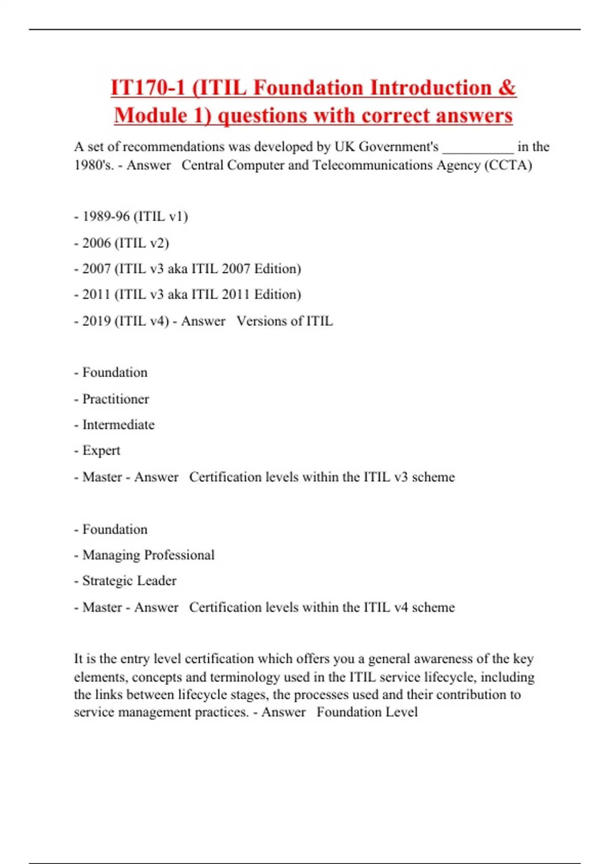 IT170-1 (ITIL Foundation Introduction & Module 1) questions with correct answers