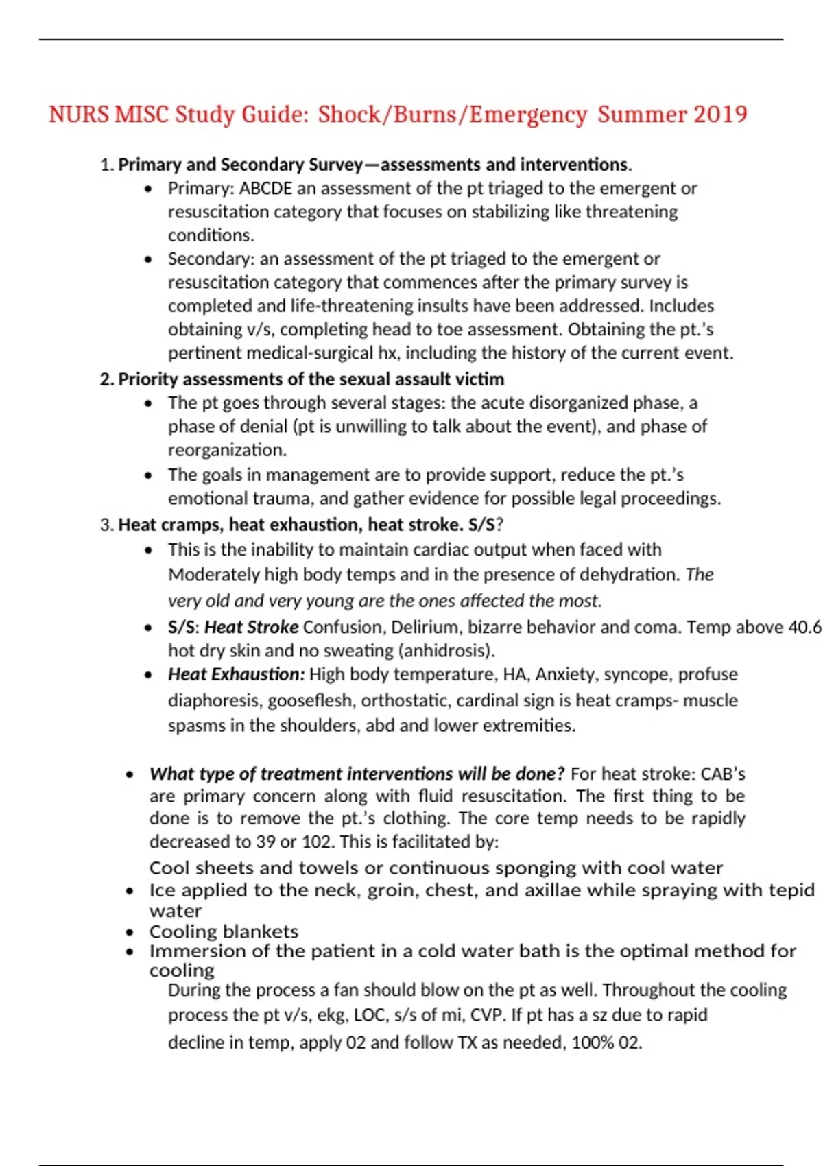 NURS MISC Study Guide: Shock/Burns/Emergency Summer 2019 1. Primary and Secondary Survey—assessments and interventions. • Primary: ABCDE an assessment of the pt triaged to the emergent or resuscitation category that focuses on stabilizing like threatening conditions. • Secondary: an assessment of the pt triaged to the emergent or resuscitation category that commences after the primary survey is completed and life-threatening insults have been addressed. Includes obtaining v/s, completing head to toe assessment. Obtaining the pt.’s pertinent medical-surgical hx, including the history of the current event. 2. Priority assessments of the sexual assault victim • The pt goes through several stages: the acute disorganized phase, a phase of denial (pt is unwilling to talk about the event), and phase of reorganization. • The goals in management are to provide support, reduce the pt.’s emotional trauma, and gather evidence for possible legal proceedings. 3. Heat cramps, heat exhaustion, heat stroke. S/S? • This is the inability to maintain cardiac output when faced with Moderately high body temps and in the presence of dehydration. The very old and very young are the ones affected the most. • S/S: Heat Stroke Confusion, Delirium, bizarre behavior and coma. Temp above 40.6, hot dry skin and no sweating (anhidrosis). • Heat Exhaustion: High body temperature, HA, Anxiety, syncope, profuse diaphoresis, gooseflesh, orthostatic, cardinal sign is heat cramps- muscle spasms in the shoulders, abd and lower extremities. • What type of treatment interventions will be done? For heat stroke: CAB’s are primary concern along with fluid resuscitation. The first thing to be done is to remove the pt.’s clothing. The core temp needs to be rapidly decreased to 39 or 102. This is facilitated by: Cool sheets and towels or continuous sponging with cool water • Ice applied to the neck, groin, chest, and axillae while spraying with tepid water • Cooling blankets • Immersion of the patient in a cold water bath is the optimal method for cooling During the process a fan should blow on the pt as well. Throughout the cooling process the pt v/s, ekg, LOC, s/s of mi, CVP. If pt has a sz due to rapid decline in temp, apply 02 and follow TX as needed, 100% 02. • Main goal is bringing down the temp as quickly as possible!!! The long the hyperthermic episode the higher the mortality rate. • What is the priority of care? Bringing down the temp 4. You will be given several pts and will have to determine who needs to be seen first…. you must go by your ABCD’s and most critical/emergent!!!!! 5. In trauma pts, what s/s relate to the most life threatening conditions? • Systolic B/P <90 mmHg • MAP <65mmHg • HR > 150bpm • Rapid shallow breathing, crackles, Pa02< 80 mmHg, PC02> 45mmHG • Skin Mottled or Petechiae • Urine Output < 0.5ml/kg/hr. • Mentation Lethargy or declining mental status • Acid base: Metabolic Acidosis 6. Fluid resuscitation • Two large-gauge IV lines are inserted (If an IV catheter cannot be quickly inserted, an intraosseous catheter may be used) • Crystalloid solutions such as lactated Ringer’s solution or 0.9% sodium chloride solution are commonly used to treat hypovolemic shock • 3:1 rule: If hypervolemia is primarily due to blood loss, the American College of Surgeons (2012) recommends administration of 3 mL of crystalloid solution for each milliliter of estimated blood loss. This is referred to as the 3:1 rule. • Patients requiring massive transfusion respond better when blood products are given in a 1:1:1: ratio, meaning units of plasma, platelets, and packed red blood cells. This covers fluid replacement, 02 carrying and coagulopathy. • 1 time bolus is 20ml/kg 7. Why is mechanism of injury significant? It reveals an injury pathway Although blunt chest trauma is more common than penetrating trauma, it is often difficult to identify the extent of the damage because the symptoms may be generalized and vague. In addition, patients may not seek immediate medical attention, which may complicate the problem. 8. Blunt versus penetrating trauma • Blunt trauma: blunt thoracic injuries are directly responsible for 20% to 25% of all trauma deaths. • Most common causes of blunt chest trauma are motor vehicle crashes (trauma from steering wheel, seat belt), falls, and bicycle crashes (trauma from handlebars). Types of blunt chest trauma include chest wall fractures, dislocations, and barotraumas (including diaphragmatic injuries); injuries of the pleura, lungs, and aero digestive tracts; and blunt injuries of the heart, great arteries, veins, and lymphatic’s o Hypoxemia from disruption of the airway; injury to the lung parenchyma, rib cage, and respiratory musculature; massive hemorrhage; collapsed lung; and pneumothorax o Hypovolemic from massive fluid loss from the great vessels, cardiac rupture, or hemothorax o Cardiac failure from cardiac tamponade, cardiac contusion, or increased intrathoracic pressure o These pathologic states frequently result in impaired V./Q. leading to acute kidney injury, hypovolemic shock, and death. • Penetrating trauma, any organ or structure within the chest is potentially susceptible to traumatic penetration. These organs include the chest wall, lung and pleura, tracheobronchial system, esophagus, diaphragm, and major thoracic blood vessels, as well as heart and other mediastinal structures. The clinical consequence of penetrating trauma to the chest depends on the mechanism of injury, location, associated injuries, and underlying illnesses. Common injuries include pneumothorax and cardiac tamponade. • Penetrating abd wounds have a high incidence of injury to hollow organs, especially the small bowel. 9. Be able to triage a pt as emergent, urgent, or non-urgent or Level I, II, or III. • Immediate intervention. Individuals in this group can progress rapidly to expectant if treatment is delayed. Prioirty: 1 Color: red. 