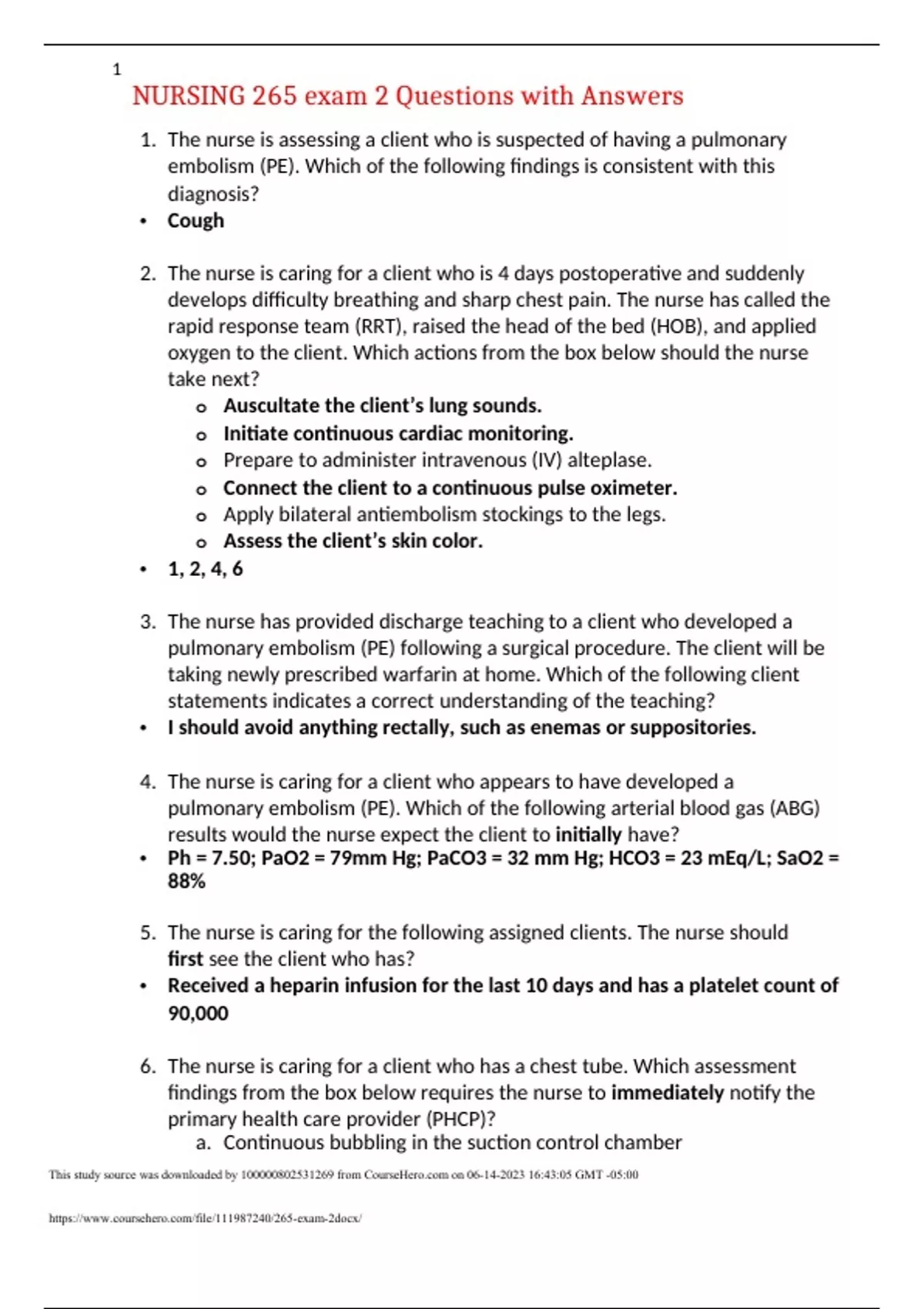 NURSING 265 exam 2 Questions with Answers 1. The nurse is assessing a client who is suspected of having a pulmonary embolism (PE). Which of the following findings is consistent with this diagnosis? • Cough 2. The nurse is caring for a client who is 4 days postoperative and suddenly develops difficulty breathing and sharp chest pain. The nurse has called the rapid response team (RRT), raised the head of the bed (HOB), and applied oxygen to the client. Which actions from the box below should the nurse take next? o Auscultate the client’s lung sounds. o Initiate continuous cardiac monitoring. o Prepare to administer intravenous (IV) alteplase. o Connect the client to a continuous pulse oximeter. o Apply bilateral antiembolism stockings to the legs. o Assess the client’s skin color. • 1, 2, 4, 6 3. The nurse has provided discharge teaching to a client who developed a pulmonary embolism (PE) following a surgical procedure. The client will be taking newly prescribed warfarin at home. Which of the following client statements indicates a correct understanding of the teaching? • I should avoid anything rectally, such as enemas or suppositories. 4. The nurse is caring for a client who appears to have developed a pulmonary embolism (PE). Which of the following arterial blood gas (ABG) results would the nurse expect the client to initially have? • Ph = 7.50; PaO2 = 79mm Hg; PaCO3 = 32 mm Hg; HCO3 = 23 mEq/L; SaO2 = 88% 5. The nurse is caring for the following assigned clients. The nurse should first see the client who has? • Received a heparin infusion for the last 10 days and has a platelet count of 90,000 6. The nurse is caring for a client who has a chest tube. Which assessment findings from the box below requires the nurse to immediately notify the primary health care provider (PHCP)? a. Continuous bubbling in the suction control chamber b. Tracheal deviation c. Tidling in the water seal chamber with breathing d. 100 mL of drainage within an hour e. Visibility of the eyelets of the chest tube f. Low water level in the water seal chamber • 2, 4, 5 7. The nurse is assessing a client who had a chest tube placed 36 hours ago for the treatment of a pneumothorax. The nurse observes continuous bubbling in the water seal chamber. Which of the following actions should the nurse take? • Inform the primary health care physician (PHCP) that there is a leak in the system 8. The nurse working in the emergency department (ED) is caring for a client who was in a boating crash 3 hours ago and has the following data: The nurse concludes that the client is developing? a. Reports a headache b. Restless and irritable c. (ABG) pH: 7.28, PaO2 60mm Hg, PaCO2 52 mm Hg, HCO3 24 mEq/L, SaO2 84% d. Pulse 110 e. Respirations 10 and dyspneic f. Blood pressure 145/86 mm Hg • Acute respiratory failure (ARF) 9. The nurse is assessing clients for the risk of developing acute respiratory distress syndrome (ARDS). The nurse should identify at greatest risk the client who? • Has sepsis and is receiving nutrition via continuous tube feeding 10. The nurse working on a medical surgical unit is caring for assigned clients. It indicates appropriate clinical judgement if the nurse initially assesses the client who has? • An arterial oxygen (PaO2) level of 59 mm Hg while receiving 100% oxygen 11. The nurse is caring for a client who developed acute respiratory distress syndrome (ARDS) and has been placed on mechanical ventilation. Which of the following is a priority action for the nurse to take? • Obtain a special bed that will turn the client 12. The nurse has attended a continuing education program on interdisciplinary care. It would indicate a correct understanding of the program if the nurse identifies that an interdisciplinary conference would be most important for the client who is • 21-year-old, is a college student, and has been receiving mechanical ventilation for 14 days for the treatment of acute respiratory distress syndrome (ARDS) 13. The nurse working in the emergency department (ED) is assessing a client who has a left pneumothorax. Which of the following assessment findings should the nurse expect? • Limited chest expansion 14. The nurse is caring for a client who is receiving mechanic ventilation. It indicates a correct understanding about managing a client on a ventilator if the nurse • Determines if the client needs to be suctioned when the high-pressure alarm sounds 15. The nurse is caring for a client who is receiving mechanical ventilation via an endotracheal (ET) tube and is unable to speak. The client’s family is frightened that the client has permanently lost their voice. Which of the following responses should the nurse make? • The tube is causing a temporary loss of the voice 16. The nurse has been made aware of the following client situations. The nurse should initially follow up with the client who is receiving. • mechanical ventilation with PEEP and develops left tracheal deviation. 17. The nurse is reviewing chest radiography (x-ray) results on an assigned client. The x-ray reveals 3 rib fractures. Based on these findings, the nurse should • Place suction set up at the bedside 18. The nurse is caring for a client who has been admitted for suspected diabetes insipidus (DI). Which of the following assessment findings is a priority for the nurse to follow-up on? • Bounding peripheral pulses with a decrease in thirst 19. The nurse has taught a client who has diabetes insipidus (DI) about self-care at home. Which of the following client statements indicates the need for further teaching? • I will test urine daily for positive ketones and report any findings. 20. The nurse is providing discharge instructions to a client who has permanent diabetes insipidus. Which of the following client statements would indicate a correct understanding of discharge instructions? • I should report if I develop increased thirst or urination. 21. The nurse caring for a client who has dev