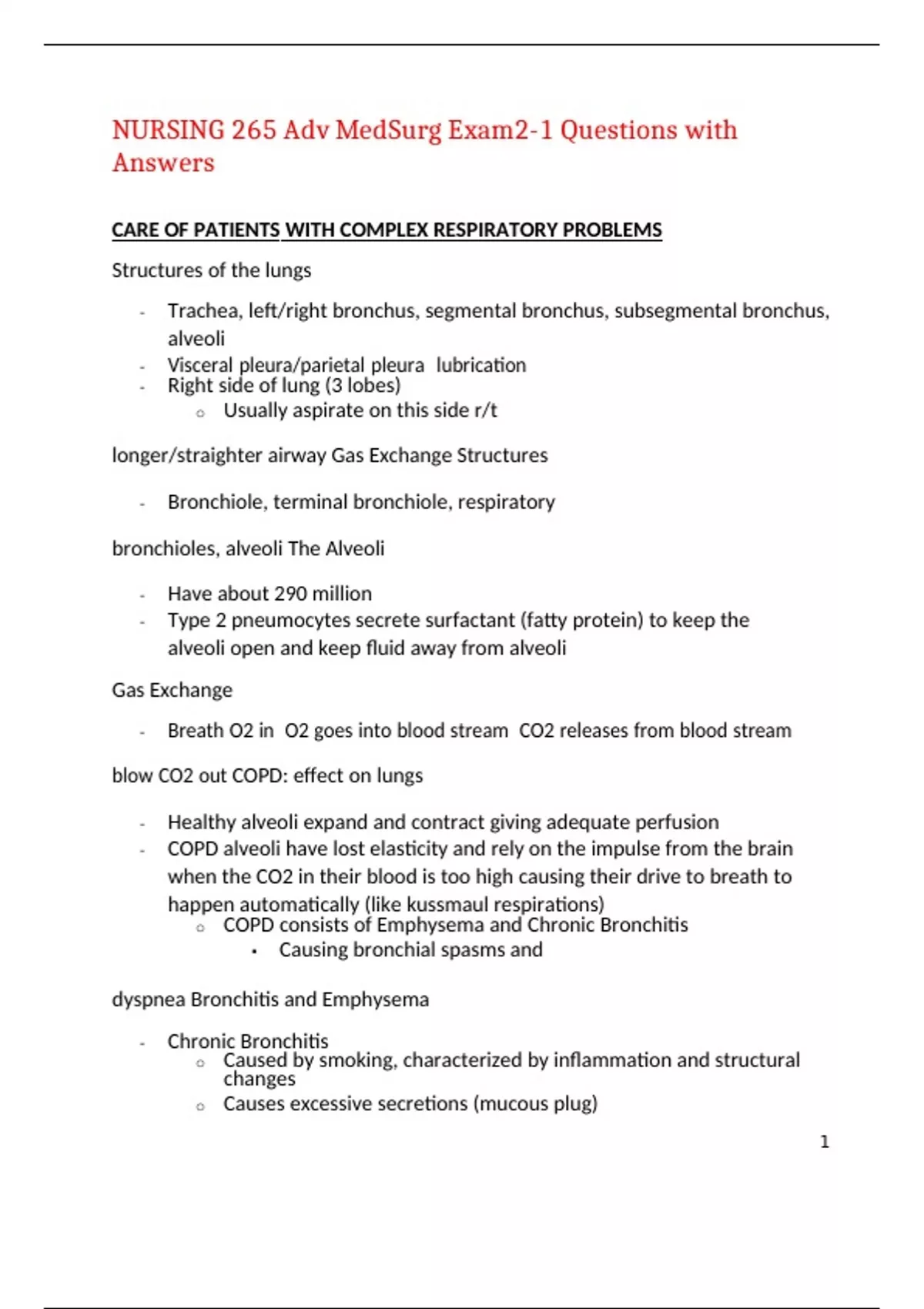 NURSING 265 Adv MedSurg Exam2-1 Questions with Answers CARE OF PATIENTS WITH COMPLEX RESPIRATORY PROBLEMS Structures of the lungs - Trachea, left/right bronchus, segmental bronchus, subsegmental bronchus, alveoli - Visceral pleura/parietal pleura lubrication - Right side of lung (3 lobes) o Usually aspirate on this side r/t longer/straighter airway Gas Exchange Structures - Bronchiole, terminal bronchiole, respiratory bronchioles, alveoli The Alveoli - Have about 290 million - Type 2 pneumocytes secrete surfactant (fatty protein) to keep the alveoli open and keep fluid away from alveoli Gas Exchange - Breath O2 in O2 goes into blood stream CO2 releases from blood stream blow CO2 out COPD: effect on lungs - Healthy alveoli expand and contract giving adequate perfusion - COPD alveoli have lost elasticity and rely on the impulse from the brain when the CO2 in their blood is too high causing their drive to breath to happen automatically (like kussmaul respirations) o COPD consists of Emphysema and Chronic Bronchitis ▪ Causing bronchial spasms and dyspnea Bronchitis and Emphysema - Chronic Bronchitis o Caused by smoking, characterized by inflammation and structural changes o Causes excessive secretions (mucous plug) - Emphysema o Elastic fibers destroyed leading to hyperinflation Acute Respiratory Failure - Progressive or sudden - Deterioration of gas exchange function in the lungs o Hypoxemia – PaO2 of less than 50 mmHg (normal 80-100) o Hypercapnia – PaCO2 greater than 50 mmHg ▪ Decreased LOC if this happens call the Doc to get blood gas o Acidosis – pH less than 7.35 (normal 7.35 – 7.45) - Ventilatory failure – Can’t get O2 in o Asthma, sleep apnea, myasthemia gravis - Oxygen failure – O2 getting in but it isn’t getting picked up o Pneumonia, ARDS, PE, shock CORRECT respiratory excursion. Clients with cervical and thoracic spinal cord injuries are at high risk for respiratory failure because spinal nerves that affect intercostal muscles are affected. Opiates, which can depress the brainstem, present risk factors for respiratory failure. All of these clients should be monitored closely for respiratory failure. Cocaine is a stimulant, which would not cause respiratory failure unless a stroke ensued. CORRECT • Client with acute pancreatitis Pressure on the brainstem may depress respiratory function. Acute pancreatitis is a risk factor for acute respiratory distress syndrome; abdominal distention also ensues, which can limit respiratory excursion. Clients with cervical and thoracic spinal cord injuries are at high risk for respiratory failure because spinal nerves that affect intercostal muscles are affected. Opiates, which can depress the brainstem, present risk factors for respiratory failure. All of these clients should be monitored closely for respiratory failure. Cocaine is a stimulant, which would not cause respiratory failure unless a stroke ensued. CORRECT • Client with a T3 spinal cord injury Pressure on the brainstem may depress respiratory function. Acute pancreatitis is a risk factor for acute respiratory distress syndrome; abdominal distention also ensues, which can limit respiratory excursion. Clients with cervical and thoracic spinal cord injuries are at high risk for respiratory failure because spinal nerves that affect intercostal muscles are affected. Opiates, which can depress the brainstem, present risk factors for respiratory failure. All of these clients should be monitored closely for respiratory failure. Cocaine is a stimulant, which would not cause respiratory failure unless a stroke ensued. CORRECT • Client using patient-controlled analgesia Pressure on the brainstem may depress respiratory function. Acute pancreatitis is a risk factor for acute respiratory distress syndrome; abdominal distention also ensues, which can limit respiratory excursion. Clients with cervical and thoracic spinal cord injuries are at high risk for respiratory failure because spinal nerves that affect intercostal muscles are affected. Opiates, which can depress the brainstem, present risk factors for respiratory failure. All of these clients should be monitored closely for respiratory failure. Cocaine is a stimulant, which would not cause respiratory failure unless a stroke ensued. - Blood Gas Values - pH = 7.35 – 7.45, pCO2 = 35 – 45 (respiratory), HCO3 = 22 – 28 (metabolic) - Increased CO2 = acid build-up, acidosis; Increased HCO3 = alkaline build-up, alkalosis - ROME (Respiratory Opposite, Metabolic Equal) Pathophysiology of Respiration - Occurs at the alveolar capillary units exchange of oxygen and carbon dioxide oxygen attaches to the circulating hemoglobin molecules 2 processes occur, ventilation and perfusion - V/Q scan measures how well the alveoli are being ventilated and perfused o Radioactive dye used to find PE o Ventilation – perfusion mismatch = PE Causes of Acute Respiratory Failure - Decreased respiratory drive (narcotics, COPD w/ too much O2) - Obstruction of the airways (Bronchitis, sleep apnea, asthma) - Trauma (Injury to the lung tissue or chest wall) - Dysfunction of the chest wall (spinal cord injury, any condition that affects breathing) - Disorders (sleep apnea, PE, overdose of opiods/alcohol) Clinical Manifestations of Acute Respiratory Failure - Early: Impaired O2 (give O2), restlessness, fatigue (promote rest), headache, dyspnea, air hunger, tachycardia, increased BP o Use interventions - Progressive: Confusion, lethargy, tachycardia, tachypnea, central cyanosis, diaphoresis, respiratory arrest o Call rapid response - Intervention Rapid response ICU Medical Management - Increased oxygenation, intubation, mechanical ventilation, ICU, bronchodilators, antibiotics, anti- inflammatories Nursing Management - Anticipate and assist with intubation - Monitor (assess): LOC, RR, O2, ABGs continuous pulse oximetry - Prevent ventilator associated pneumonia Acute Respiratory Distress Syndrome (ARDS) - Severe form of acute lung injury, usually res