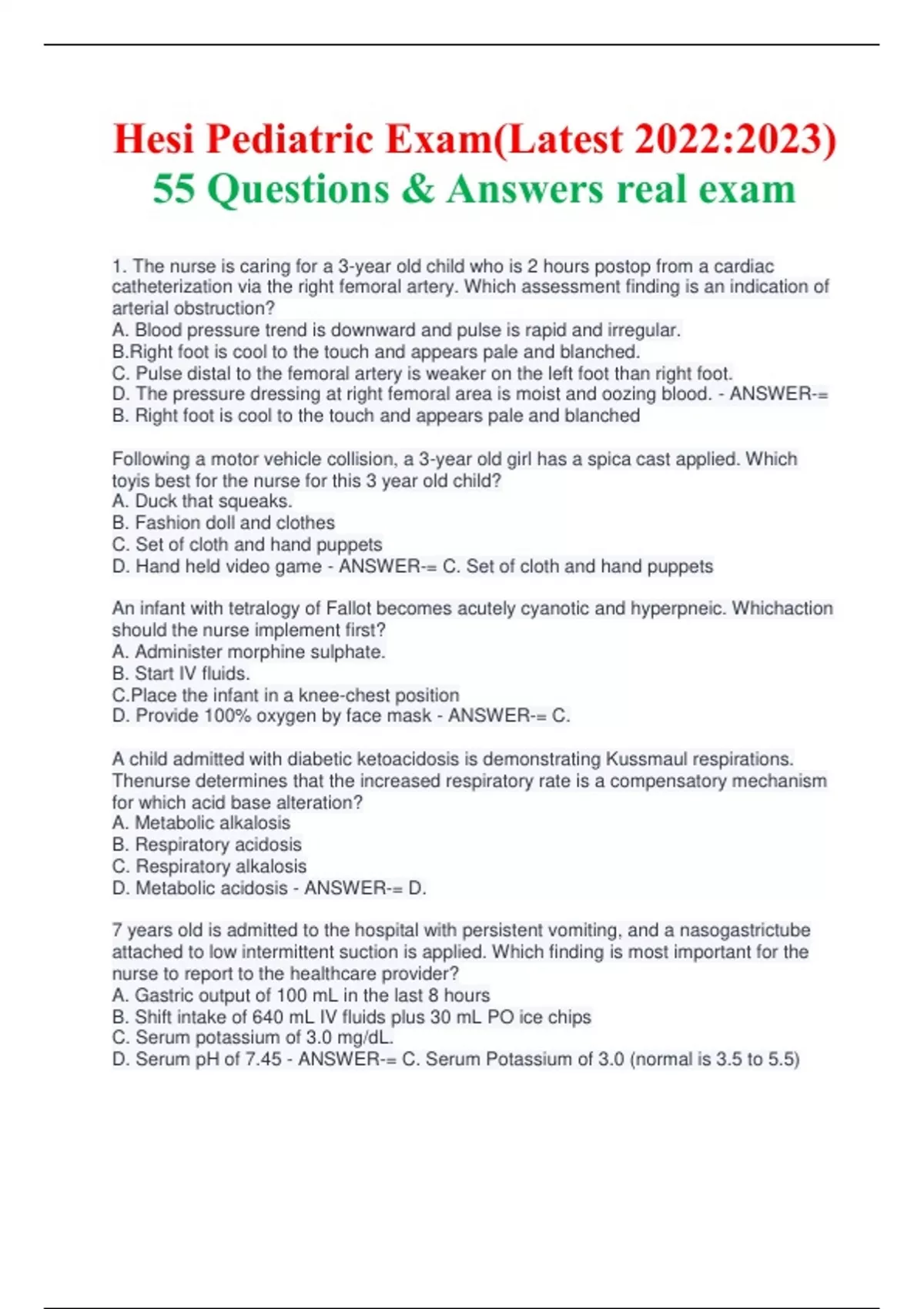 Hesi Pediatric Exam(Latest 2022:2023) 55 Questions & Answers real exam 1. The nurse is caring for a 3-year old child who is 2 hours postop from a cardiac catheterization via the right femoral artery. Which assessment finding is an indication of arterial obstruction? A. Blood pressure trend is downward and pulse is rapid and irregular. B.Right foot is cool to the touch and appears pale and blanched. C. Pulse distal to the femoral artery is weaker on the left foot than right foot. D. The pressure dressing at right femoral area is moist and oozing blood. - ANSWER-= B. Right foot is cool to the touch and appears pale and blanched Following a motor vehicle collision, a 3-year old girl has a spica cast applied. Which toyis best for the nurse for this 3 year old child? A. Duck that squeaks. B. Fashion doll and clothes C. Set of cloth and hand puppets D. Hand held video game - ANSWER-= C. Set of cloth and hand puppets An infant with tetralogy of Fallot becomes acutely cyanotic and hyperpneic. Whichaction should the nurse implement first? A. Administer morphine sulphate. B. Start IV fluids. C.Place the infant in a knee-chest position D. Provide 100% oxygen by face mask - ANSWER-= C. A child admitted with diabetic ketoacidosis is demonstrating Kussmaul respirations. Thenurse determines that the increased respiratory rate is a compensatory mechanism for which acid base alteration? A. Metabolic alkalosis B. Respiratory acidosis C. Respiratory alkalosis D. Metabolic acidosis - ANSWER-= D