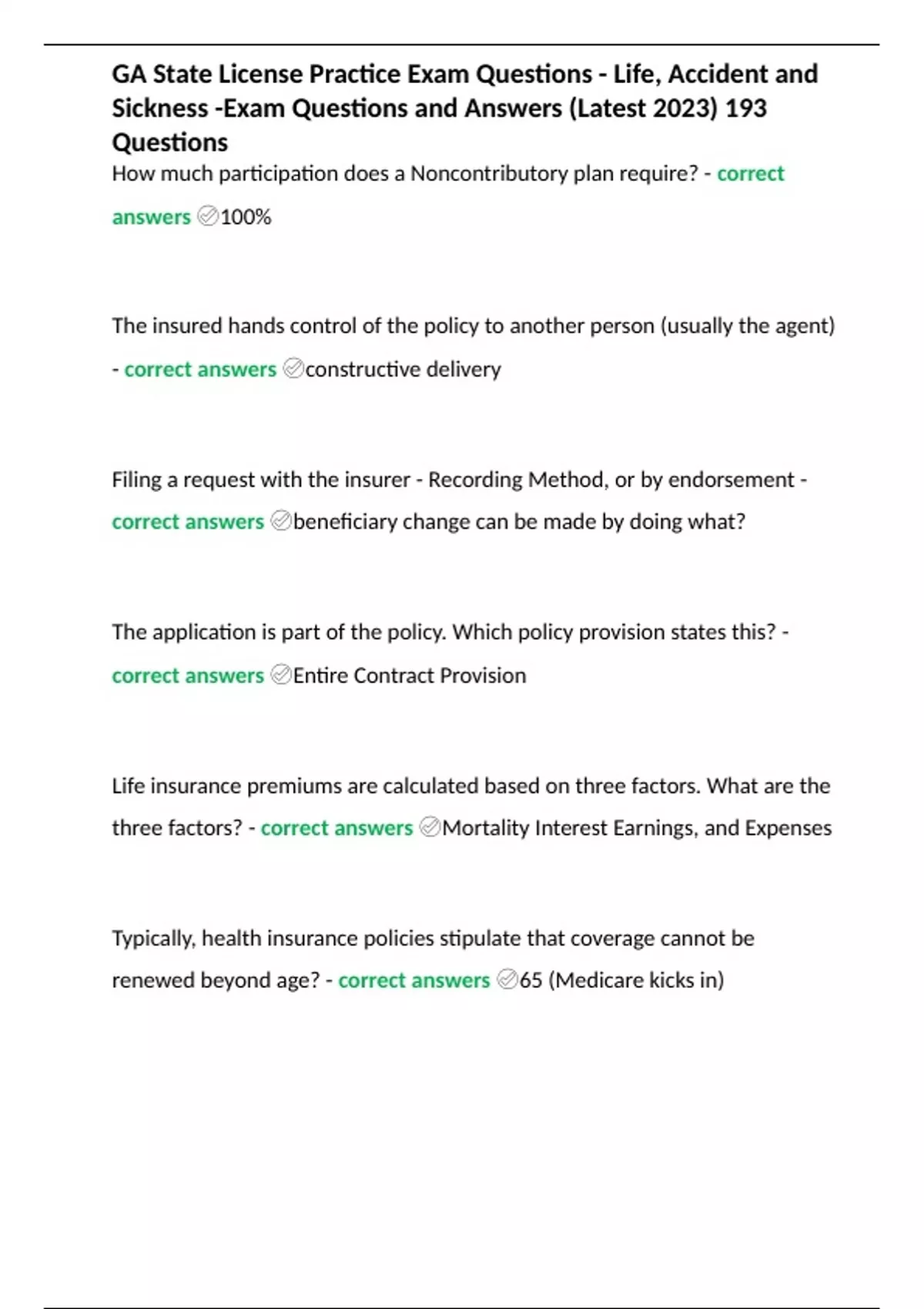 GA State License Practice Exam Questions - Life, Accident and Sickness -Exam Questions and Answers (Latest 2023) 193 Questions