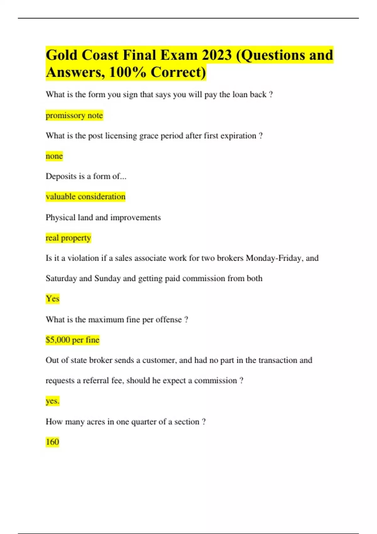 Gold Coast Final Exam 2023 (Questions and Answers, 100% Correct) Gold Coast Final Exam 2023 (Questions and Answers, 100% Correct) What is the form you sign that says you will pay the loan back ? promissory note What is the post licensing grace period after first expiration ? none Deposits is a form of... valuable consideration Physical land and improvements real property Is it a violation if a sales associate work for two brokers Monday-Friday, and Saturday and Sunday and getting paid commission from both Yes What is the maximum fine per offense ? $5,000 per fine Out of state broker sends a customer, and had no part in the transaction and requests a referral fee, should he expect a commission ? yes. How many acres in one quarter of a section ? 160 What do you do when there is conflict in who escrow goes to notify FREC When do you NOT have to notify FREC about conflict of escrow ?
