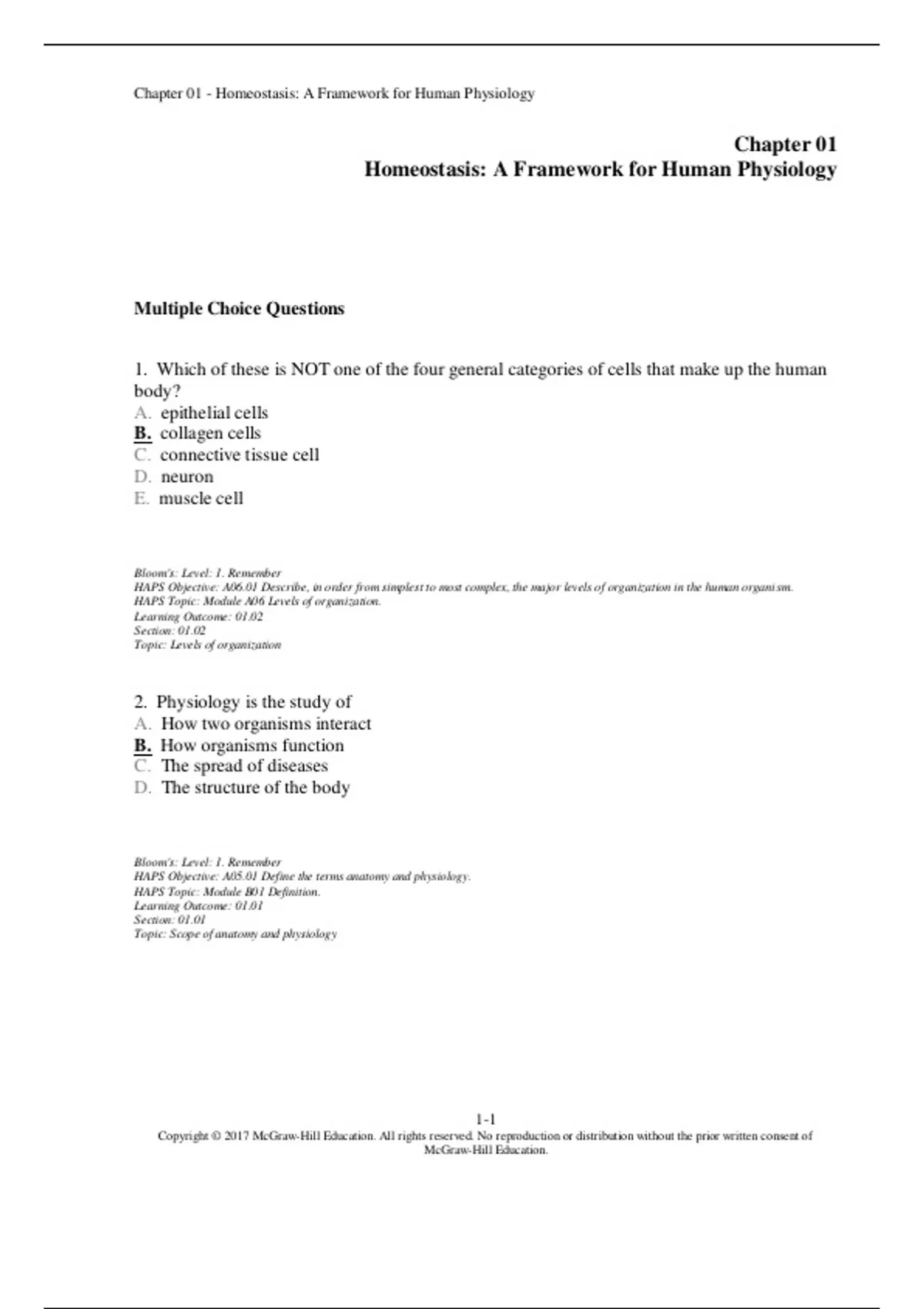 Homeostasis: A Framework for Human Physiology McGraw-Hill Education Multiple Choice Questions 1. Which of these is NOT one of the four general categories of cells that make up the human body? A. epithelial cells B. collagen cells C. connective tissue cell D. neuron E. muscle cell Bloom's: Level: 1. Remember HAPS Objective: A06.01 Describe, in order from simplest to most complex, the major levels of organization in the human organism. HAPS Topic: Module A06 Levels of organization. Learning Outcome: 01.02 Section: 01.02 Topic: Levels of organization 2. Physiology is the study of A. How two organisms interact B. How organisms function C. The spread of diseases D. The structure of the body Bloom's: Level: 1. Remember HAPS Objective: A05.01 Define the terms anatomy and physiology. HAPS Topic: Module B01 Definition. Learning Outcome: 01.01 Section: 01.01 Topic: Scope of anatomy and physiology