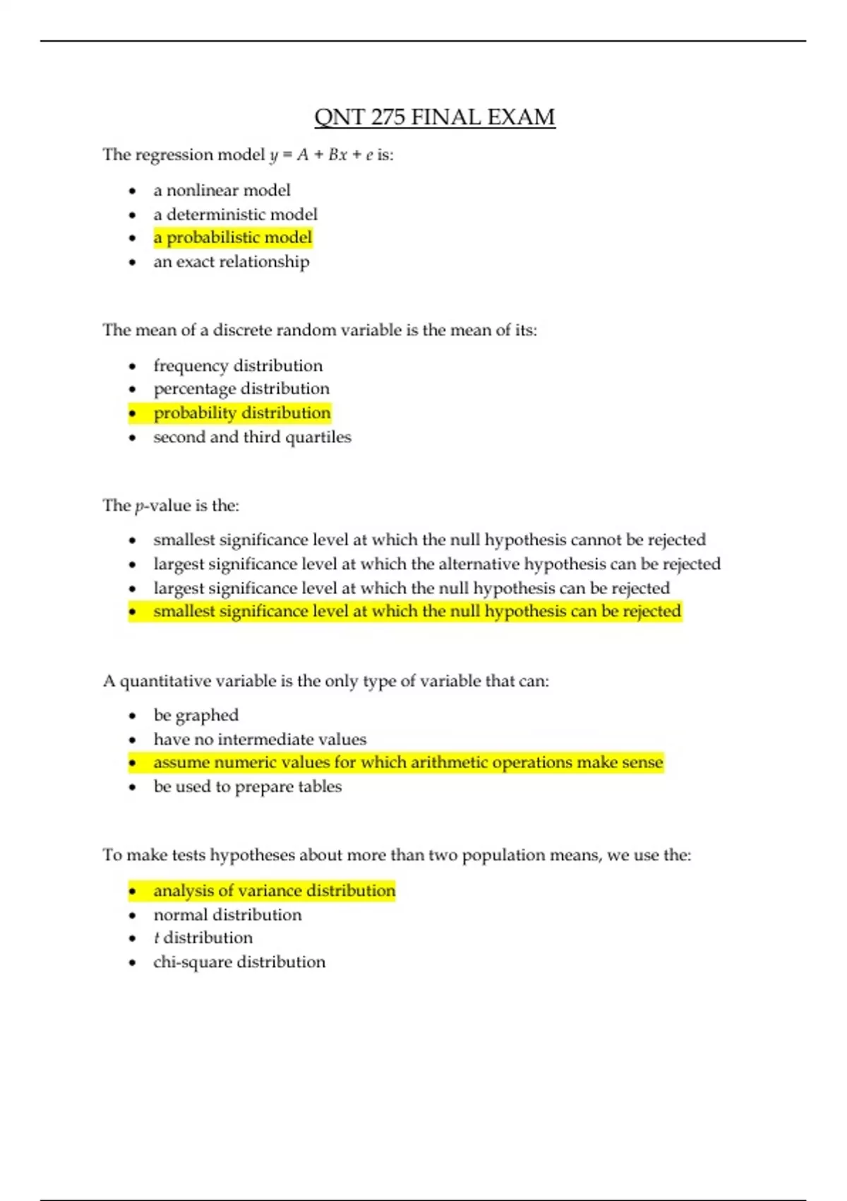 QNT 275 FINAL EXAM.The regression model y = A + Bx + e is:  a nonlinear model  a deterministic model  a probabilistic model  an exact relationship The mean of a discrete random variable is the mean of its:  frequency distribution  percentage distribution  probability distribution  second and third quartiles The p-value is the:  smallest significance level at which the null hypothesis cannot be rejected  largest significance level at which the alternative hypothesis can be rejected  largest significance level at which the null hypothesis can be rejected  smallest significance level at which the null hypothesis can be rejected A quantitative variable is the only type of variable that can:  be graphed  have no intermediate values  assume numeric values for which arithmetic operations make sense  be used to prepare tables To make tests hypotheses about more than two population means, we use the:  analysis of variance distribution  normal distribution  t distribution  chi-square distribution