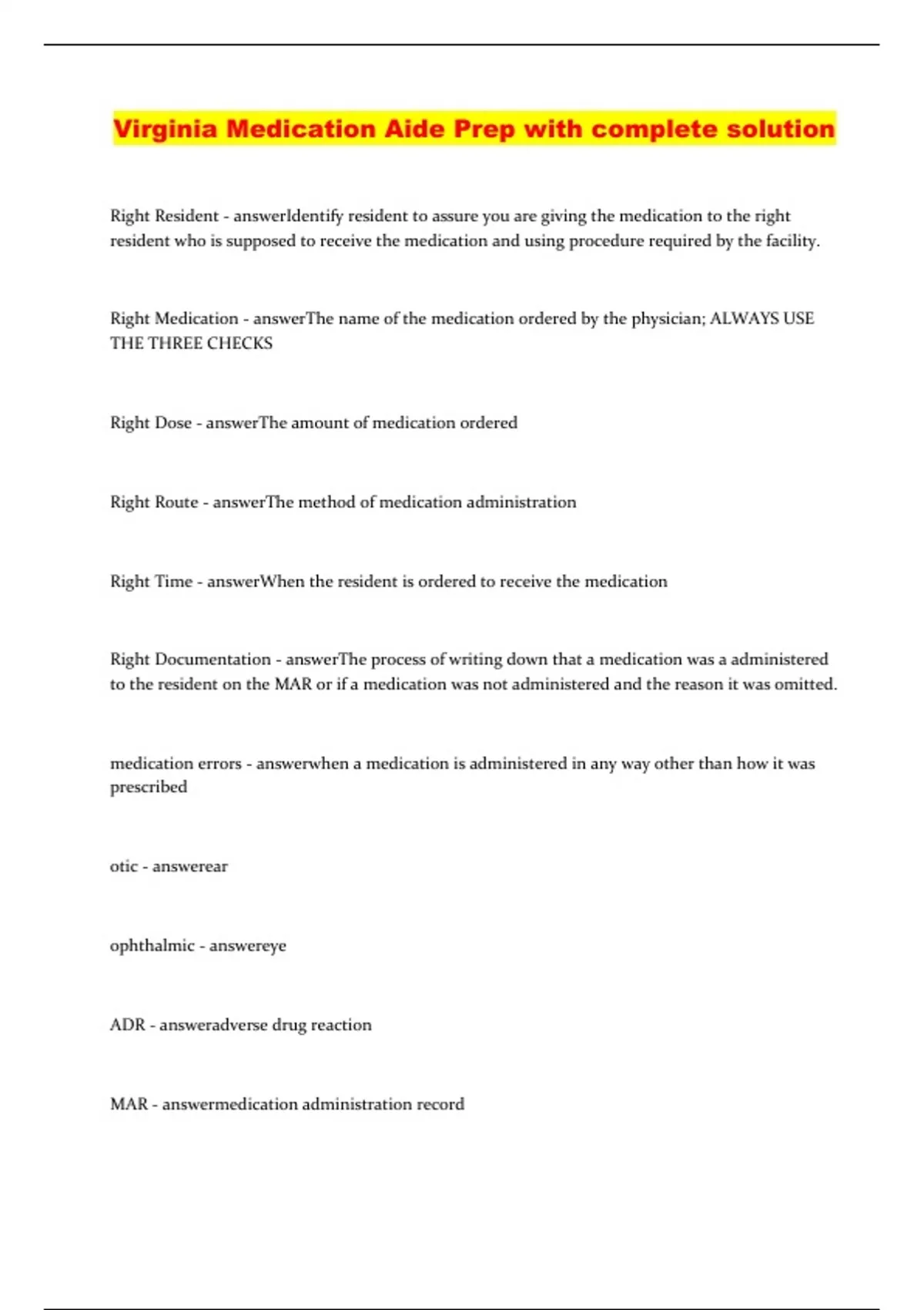 Virginia Medication Aide Prep with complete solution Right Resident - answerIdentify resident to assure you are giving the medication to the right resident who is supposed to receive the medication and using procedure required by the facility. Right Medication - answerThe name of the medication ordered by the physician; ALWAYS USE THE THREE CHECKS Right Dose - answerThe amount of medication ordered Right Route - answerThe method of medication administration Right Time - answerWhen the resident is ordered to receive the medication Right Documentation - answerThe process of writing down that a medication was a administered to the resident on the MAR or if a medication was not administered and the reason it was omitted. medication errors - answerwhen a medication is administered in any way other than how it was prescribed otic - answerear ophthalmic - answereye ADR - answeradverse drug reaction MAR - answermedication administration record window to pass meds - answer1 hour before or 1 hour afterwards tab - answertablet cap - answercapsule sol - answersolution syr - answersyrup oint - answerointment crm - answercream supp - answersuppository
