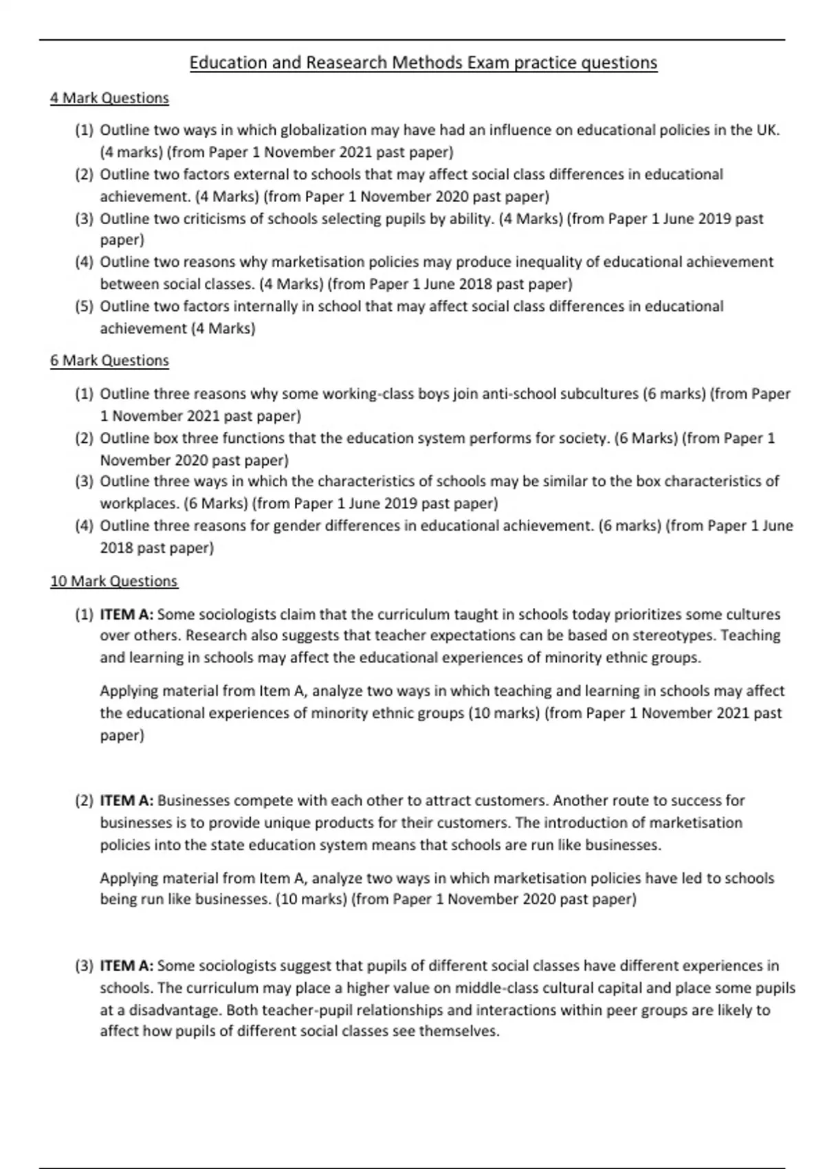 AQA A-Level Sociology: Education and Research Methods- Exam / Practice questions