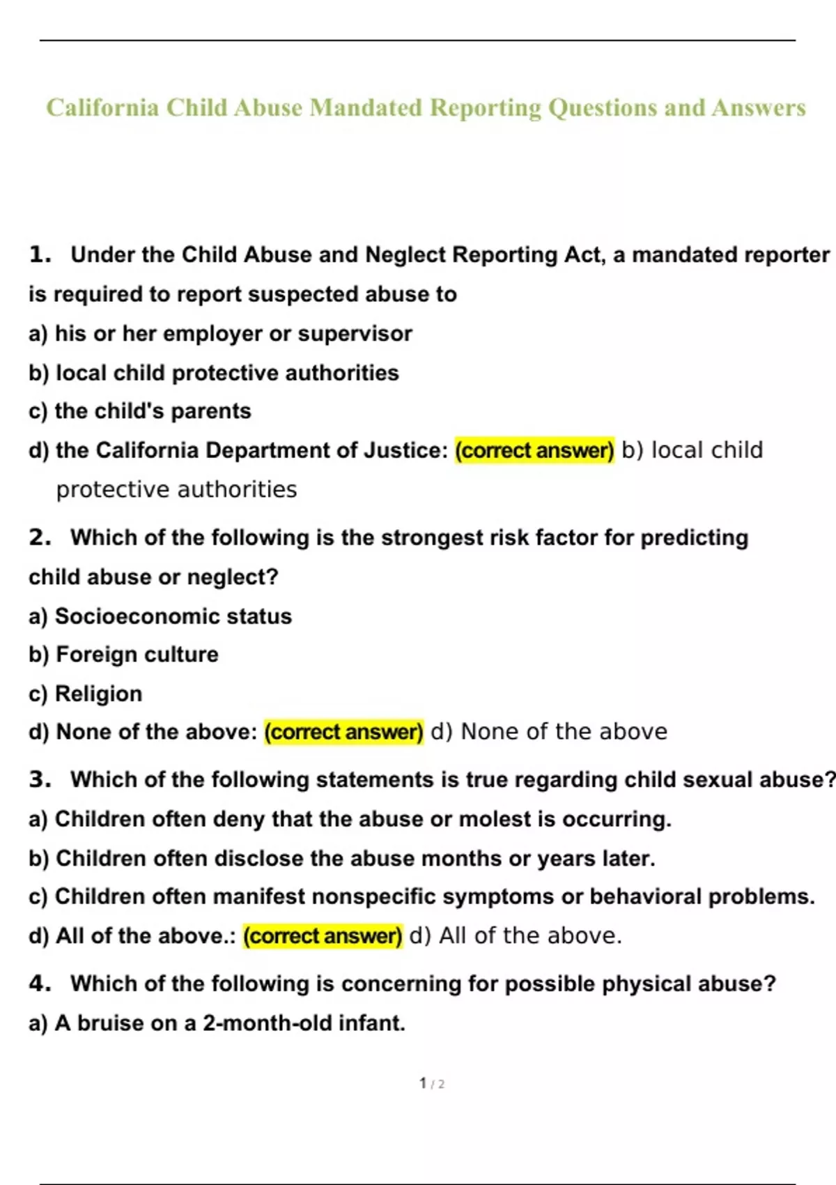 California Child Abuse Mandated Reporting Questions and Answers with complete solution