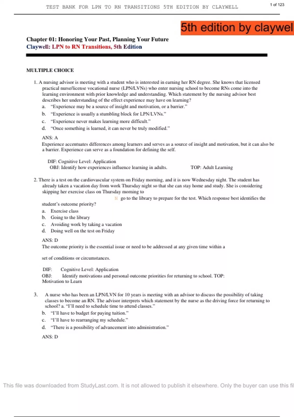 A nursing advisor is meeting with a student who is interested in earning her RN degree. She knows that licensed practical nurse/license vocational nurse (LPN/LVNs) who enter nursing school to become RNs come into the learning environment with prior knowledge and understanding. Which statement by the nursing advisor best describes her understanding of the effect experience may have on learning? a. “Experience may be a source of insight and motivation, or a barrier.” b. “Experience is usually a stumbling block for LPN/LVNs.” c. “Experience never makes learning more difficult.” d. “Once something is learned, it can never be truly modified.” ANS: A Experience accentuates differences among learners and serves as a source of insight and motivation, but it can also be a barrier. Experience can serve as a foundation for defining the self. DIF: Cognitive Level: Application OBJ: Identify how experiences influence learning in adults. TOP: Adult Learning 2. There is a test on the cardiovascular system on Friday morning, and it is now Wednesday night. The student has already taken a vacation day from work Thursday night so that she can stay home and study. She is considering skipping her exercise class on Thursday morning to N go to the library to prepare for the test. Which response best identifies the student’s outcome priority? a. Exercise class b. Going to the library c. Avoiding work by taking a vacation d. Doing well on the test on Friday ANS: D The outcome priority is the essential issue or need to be addressed at any given time within a set of conditions or circumstances. DIF: Cognitive Level: Application OBJ: Identify motivations and personal outcome priorities for returning to school. TOP: Motivation to Learn 3. A nurse who has been an LPN/LVN for 10 years is meeting with an advisor to discuss the possibility of taking classes to become an RN. The advisor interprets which statement by the nurse as the driving force for returning to school? a. “I’ll need to schedule time to attend classes.” b. “I’ll have to budget for paying tuition.” c. “I’ll have to rearranging my schedule.” d. “There is a possibility of advancement into administration.” ANS: D 1 of 123 This file was downloaded from StudyL. It is not allowed to publish it elsewhere. Only the buyer can use this file. TEST BANK FOR LPN TO RN TRANSITIONS 5TH EDITION BY CLAYWELL Driving forces are those that push toward making the change, as opposed to restraining forces, which are those that usually present a challenge that needs to be overcome for the change to take place or present a negative effect the change may initiate. DIF: Cognitive Level: Application OBJ: Identify motivations and personal outcome priorities for returning to school. TOP: Motivations for Change 4. An RN is caring for a diabetic patient. The patient appears interested in changing her lifestyle and has been asking questions about eating better. The nurse can interpret this behavior as which stage of Lewin’s Change Theory? a. Moving b. Unfreezing c. Action d. Refreezing ANS: B The patient is in the first phase of Lewin’s Change Theory, known as unfreezing. This phase involves determining that a change needs to occur and deciding to take action. Moving is the second phase and involves actively planning changes and taking action on them. Refreezing is the last stage, and it occurs when the change has become a part of the person’s life. DIF: Cognitive Level: Analysis OBJ: Understand Change Theory and how it applies to becoming an RN. TOP: Change Theory 5. An LPN is talking with her clinical instructor about her decision to return to school to become an RN. The clinical instructor interprets the LPNs outcome priority based on which N statement? a. “My family wanted me to go back to school.” b. “I want to better my financial situation.” c. “I really enjoy school.” d. “I would like to advance to a teaching role someday.” ANS: B The outcome priority is the essential need that must be addressed, determined by internal and external factors, such as needing to better a financial situation. The other statements indicate reasons for returning to school, but they are not essential needs or issues to be addressed. DIF: Cognitive Level: Analysis OBJ: Identify how experiences influence learning in adults. TOP: Adult Learning 6. A nurse notices a posting for a management position for which she is qualified. If the nurse is in the moving phase of Lewin’s Change Theory, which statement reflects the action she is most likely to take? a. Does nothing to obtain the position b. Applies for the position c. Identifies that change is needed d. Settles into the routine of her job ANS: B Unfreezing begins when reasons for change are identified. The moving phase involves active planning and action. Moving also means you are dealing with both positive and negative forces as they ebb and flow, and you are making modifications to your plan as needed. Refreezing occurs after the change has become routine. DIF: Cognitive Level: Application 2 of 123 This file was downloaded from StudyL. It is not allowed to publish it elsewhere. Only the buyer can use this file. TEST BANK FOR LPN TO RN TRANSITIONS 5TH EDITION BY CLAYWELL OBJ: Understand Change Theory and how it applies to becoming an RN. TOP: Change Theory 7. An Orthopedic Nurse is contemplating changes in her professional life and identifying goals. Which action should the nurse take if she is interested in pursuing a long-term goal? a. Studies for a telemetry exam scheduled for next week b. Enrolls in a Nurse Practitioner program c. Attends a seminar to become a charge nurse d. Continues to work on the orthopedic floor full-time ANS: B A short-term goal is one that can be attained in a period of 6 months or less. Short-term goals include becoming a charge nurse and passing the telemetry exam. A long-term goal is attained in greater than 6 months and includes studying to become a Nurse Practi