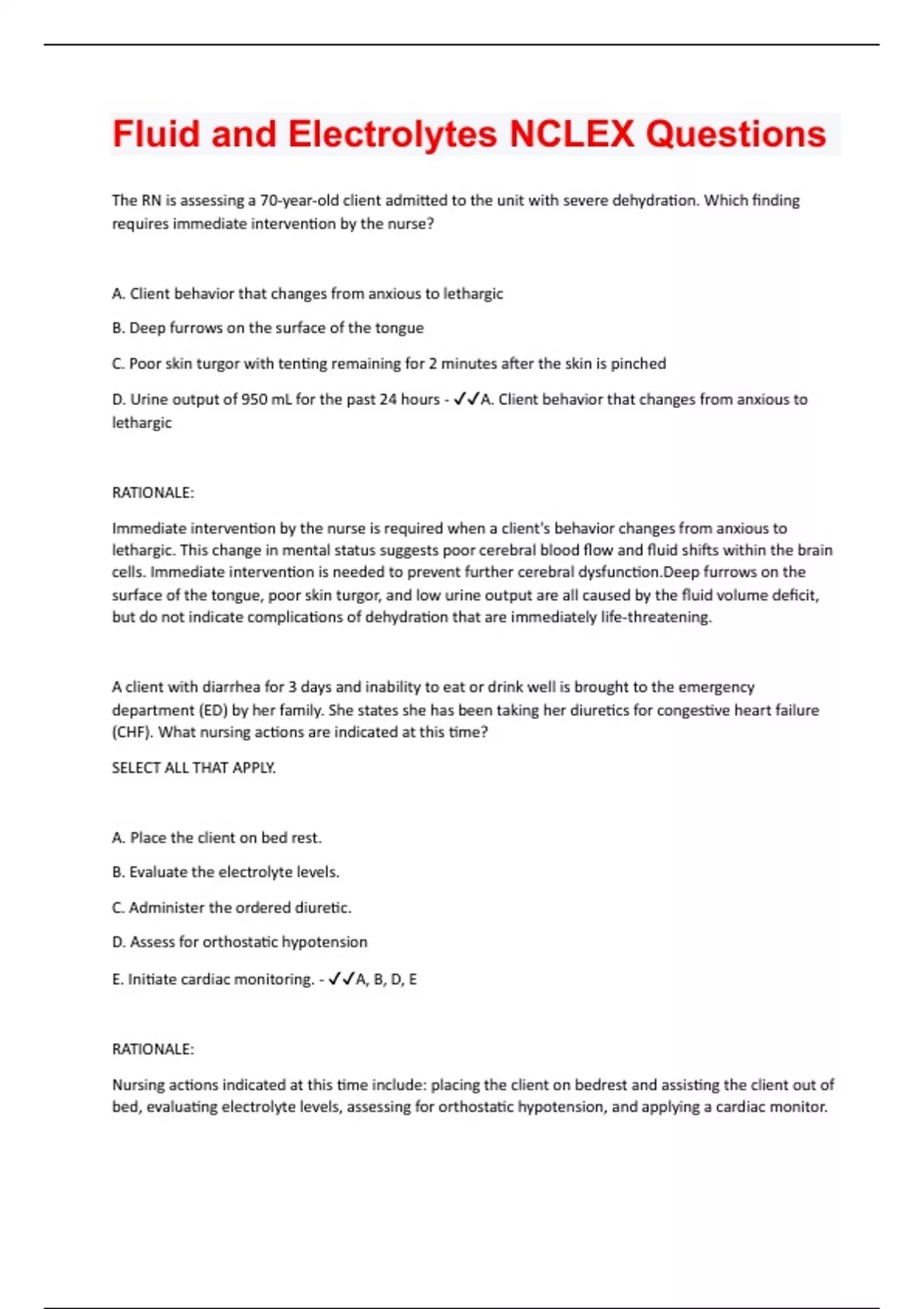 The RN is assessing a 70-year-old client admitted to the unit with severe dehydration. Which finding requires immediate intervention by the nurse? A. Client behavior that changes from anxious to lethargic B. Deep furrows on the surface of the tongue C. Poor skin turgor with tenting remaining for 2 minutes after the skin is pinched D. Urine output of 950 mL for the past 24 hours - A. Client behavior that changes from anxious to lethargic RATIONALE: Immediate intervention by the nurse is required when a client's behavior changes from anxious to lethargic. This change in mental status suggests poor cerebral blood flow and fluid shifts within the brain cells. Immediate intervention is needed to prevent further cerebral dysfunction.Deep furrows on the surface of the tongue, poor skin turgor, and low urine output are all caused by the fluid volume deficit, but do not indicate complications of dehydration that are immediately life-threatening. A client with diarrhea for 3 days and inability to eat or drink well is brought to the emergency department (ED) by her family. She states she has been taking her diuretics for congestive heart failure (CHF). What nursing actions are indicated at this time? SELECT ALL THAT APPLY. A. Place the client on bed rest. B. Evaluate the electrolyte levels. C. Administer the ordered diuretic. D. Assess for orthostatic hypotension E. Initiate cardiac monitoring. - A, B, D, E RATIONALE: Nursing actions indicated at this time include: placing the client on bedrest and assisting the client out of bed, evaluating electrolyte levels, assessing for orthostatic hypotension, and applying a cardiac monitor.Safety is require