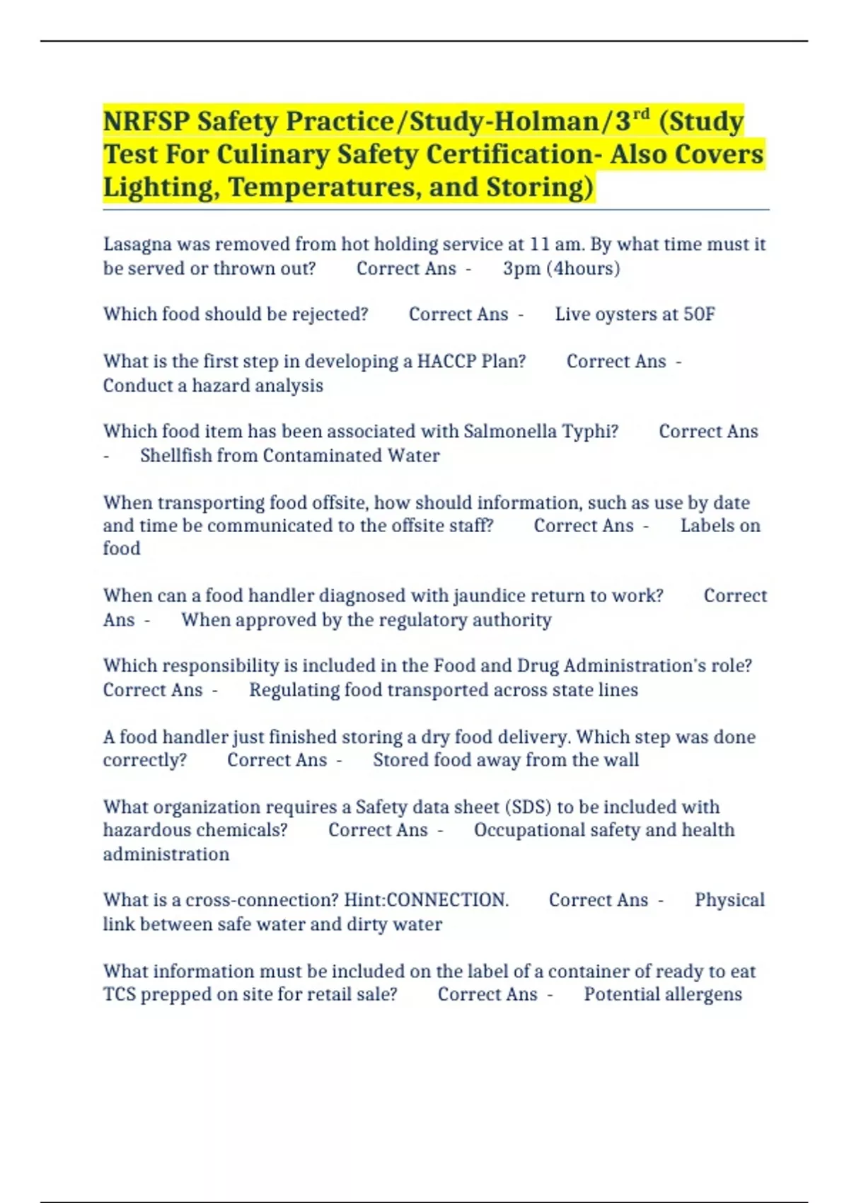 NRFSP Safety Practice/Study-Holman/3rd (Study Test For Culinary Safety Certification- Also Covers Lighting, Temperatures, and Storing)