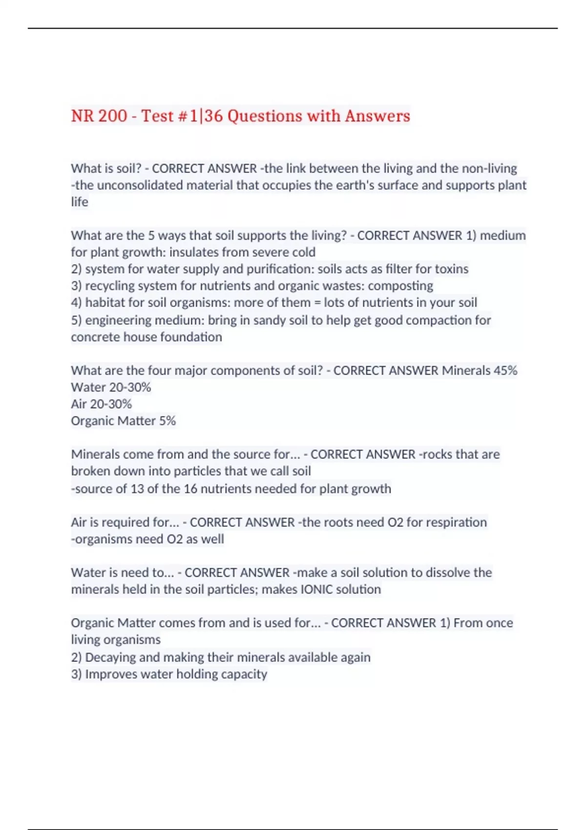 NR 200 - Test #1|36 Questions with Answers What is soil? - CORRECT ANSWER -the link between the living and the non-living -the unconsolidated material that occupies the earth's surface and supports plant life What are the 5 ways that soil supports the living? - CORRECT ANSWER 1) medium for plant growth: insulates from severe cold 2) system for water supply and purification: soils acts as filter for toxins 3) recycling system for nutrients and organic wastes: composting 4) habitat for soil organisms: more of them = lots of nutrients in your soil 5) engineering medium: bring in sandy soil to help get good compaction for concrete house foundation What are the four major components of soil? - CORRECT ANSWER Minerals 45% Water 20-30% Air 20-30% Organic Matter 5% Minerals come from and the source for... - CORRECT ANSWER -rocks that are broken down into particles that we call soil -source of 13 of the 16 nutrients needed for plant growth Air is required for... - CORRECT ANSWER -the roots need O2 for respiration -organisms need O2 as well Water is need to... - CORRECT ANSWER -make a soil solution to dissolve the minerals held in the soil particles; makes IONIC solution Organic Matter comes from and is used for... - CORRECT ANSWER 1) From once living organisms 2) Decaying and making their minerals available again 3) Improves water holding capacity 4) Humus is the longer lasting material that is responsible for this water holding ability, colloidal. What 6 things does the soil need to provide for the plant to grow successfully? - CORRECT ANSWER A. Anchorage B. Oxygen C. Water D. Temperature Moderation E. Nutrients F. Free from Harmful Organisms A. Anchorage - CORRECT ANSWER 1) Needed to allow the plant to have as many leaves positioned to accept sunlight 2) Keep plant in place to receive water and minerals B. Oxygen - CORRECT ANSWER 1) Needed to allow for respiration 2) Needed for microorganisms to flourish C. Water - CORRECT ANSWER 1) Almost all the water the plants need comes from the soil 2) Also important for the microbial action in the soil 3) Important for nutrient absorption 4) pH: the degree of alkalinity or acidity of the soil solution or soil pH range - 1 - 7 - 14 a logarithmic relationship D. Temperature Moderation - CORRECT ANSWER 1) The ability of the soil to insulate itself from the extreme hot and cold of the air above it. 2) Allows the roots to grow and an environment favorable to microorganisms E. Nutrients - CORRECT ANSWER -16 essential for plant growth 1) Only C,H and O are taken in by the plant from the atmosphere the other 13 are from the soil IMPORTANT: Ni, Co, Na and Si 2) Root hairs are the plant structure responsible for bring in the nutrients and water. 3) The elements must be brought into the plant via ionic solution that is, ions dissolved in solution. These ions go into solution from the colloids in the soil. Pg 25 What are the 5 main soil horizons? - CORRECT ANSWER O- Organic Layer A- Topsoil B - Sub Soil or TRANSITION LAYER or Zone of Accumulation, Illuviation C- Parent Material R-Bedrock O- Organic Layer - CORRECT ANSWER i - under decomposed organic material a - organic material highly decomposed A- Topsoil - CORRECT ANSWER -the most productive soil p - plowed or other cultivated disturbance (man made) 1) Best for nutrient holding, water capacity, micro-organisms 2) The most important soil profile for plant life B- Sub Soil - CORRECT ANSWER m - cemented zone usually silicates or calcium g - strong gleying C. Parent Material - CORRECT ANSWER broken down but not subject to the soil forming properties as the above solum (A&B) and not massive in structure as R- Bedrock What is soil texture and how many are there? - CORRECT ANSWER -the amount of sand, silt, and clay in the soil there are 12 What are the size of the particles of sand, silt, and clay? - CORRECT ANSWER Sand: 2 - .05 mm Silt: .05 - .002 mm Clay: less than .002 mm What is soil structure? - CORRECT ANSWER -the way these smaller aggregates form larger particles What 4 factors interact for form soil or the pedosphere? - CORRECT ANSWER Atmosphere - soil air Biosphere - organic matter Hydrosphere - soil water Lithosphere - soil particles What is soil used for? - CORRECT ANSWER 1) Agriculture 2) Non-Agriculture a) Recreation b) Foundations c) Waste disposal d) building materials 3) Land use of the future???? What are the 5 soil forming factors? - CORRECT ANSWER A. Parent Material Origins B. Climate C. Biota (Living Organisms) D. Topography E. Time Igenous Rock - CORRECT ANSWER ¼ of the earth's surface solidification of molten rock a) Granite - intrusive i. Quartz - weathers to form sand ii. Feldspar biotite - form clays b) Basalt - extrusive Sedimentary Rock - CORRECT ANSWER a great majority of the earth's surface, readily breaks down into soil. Consolidation by silicates and carbonates cementing together a) Limestone - organic marine animal formation b) Sandstone Metamorphic Rock - CORRECT ANSWER - rock that is heated under pressure and changes-generally resists weathering. a) Marble b) Slate c) Gneiss d) Talc- which is ground into powder. e) Graphite- used in pencils and lubricants. f) Serpentinite What are the four factors in Climate forming soil? - CORRECT ANSWER heat water freezing wind What are the 3 factors of the Biota that form soil? - CORRECT ANSWER 1) Plants * Accumulation can form peat bogs, Moss Peat, Herbaceous peat, Woody peat and sedimentary peat 2) Micro-organisms * Animals turning the soil - pedoturbation 3) Macro-organisms What are the 3 factors of topography that form soil? - CORRECT ANSWER 1) Moving soil by water and gravity 2) Low - accumulate salts, if saturated then reduced om degradation 3) Steep areas are never allowed to develop the soil profile as the unconsolidated material leaves the site. What are the modes of soil transportation and what are the fancy names for each? - CORRECT ANSWER a) Glacial Ice - Moraine b) Wind - Eolian c) Water - Stream -Alluvial Lake - Lacustrine Oceans - Mar