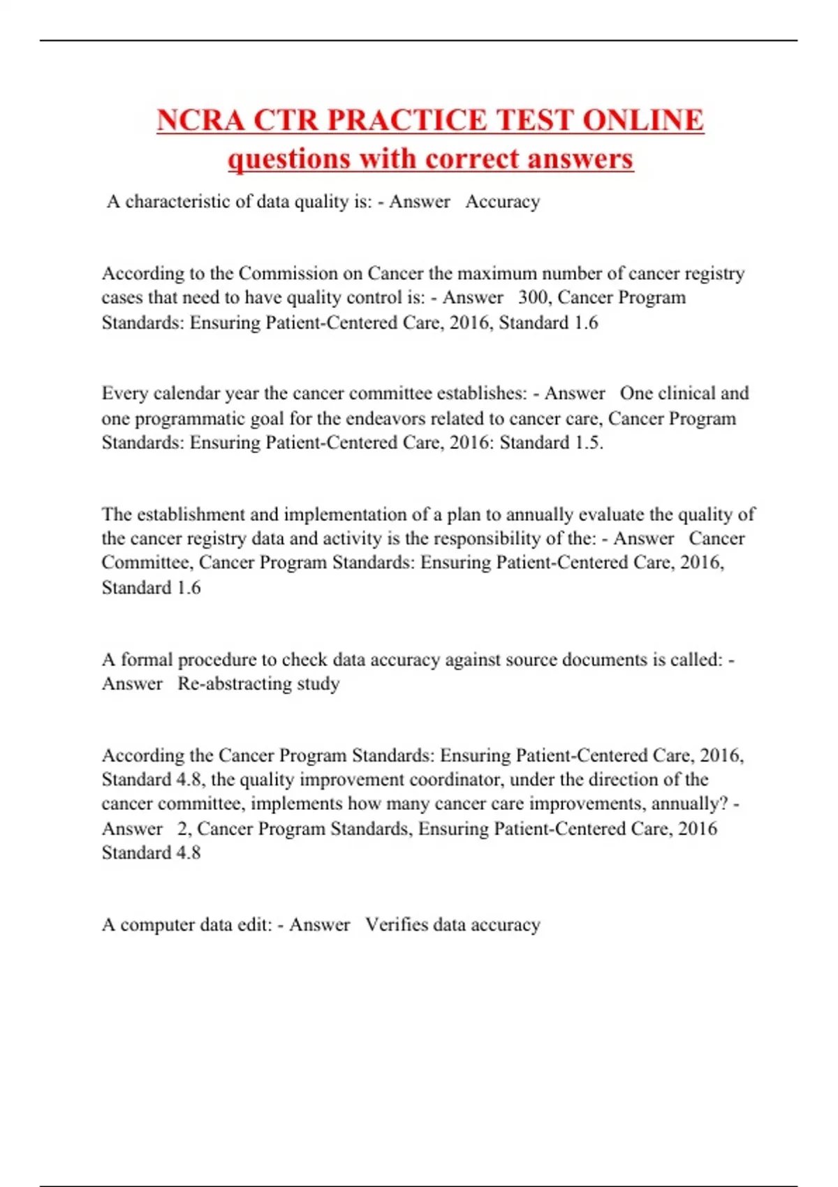 A characteristic of data quality is: - Answer Accuracy According to the Commission on Cancer the maximum number of cancer registry cases that need to have quality control is: - Answer 300, Cancer Program Standards: Ensuring Patient-Centered Care, 2016, Standard 1.6 Every calendar year the cancer committee establishes: - Answer One clinical and one programmatic goal for the endeavors related to cancer care, Cancer Program Standards: Ensuring Patient-Centered Care, 2016: Standard 1.5. The establishment and implementation of a plan to annually evaluate the quality of the cancer registry data and activity is the responsibility of the: - Answer Cancer Committee, Cancer Program Standards: Ensuring Patient-Centered Care, 2016, Standard 1.6 A formal procedure to check data accuracy against source documents is called: - Answer Re-abstracting study According the Cancer Program Standards: Ensuring Patient-Centered Care, 2016, Standard 4.8, the quality improvement coordinator, under the direction of the cancer committee, implements how many cancer care improvements, annually? - Answer 2, Cancer Program Standards, Ensuring Patient-Centered Care, 2016 Standard 4.8 A computer data edit: - Answer Verifies data accuracy