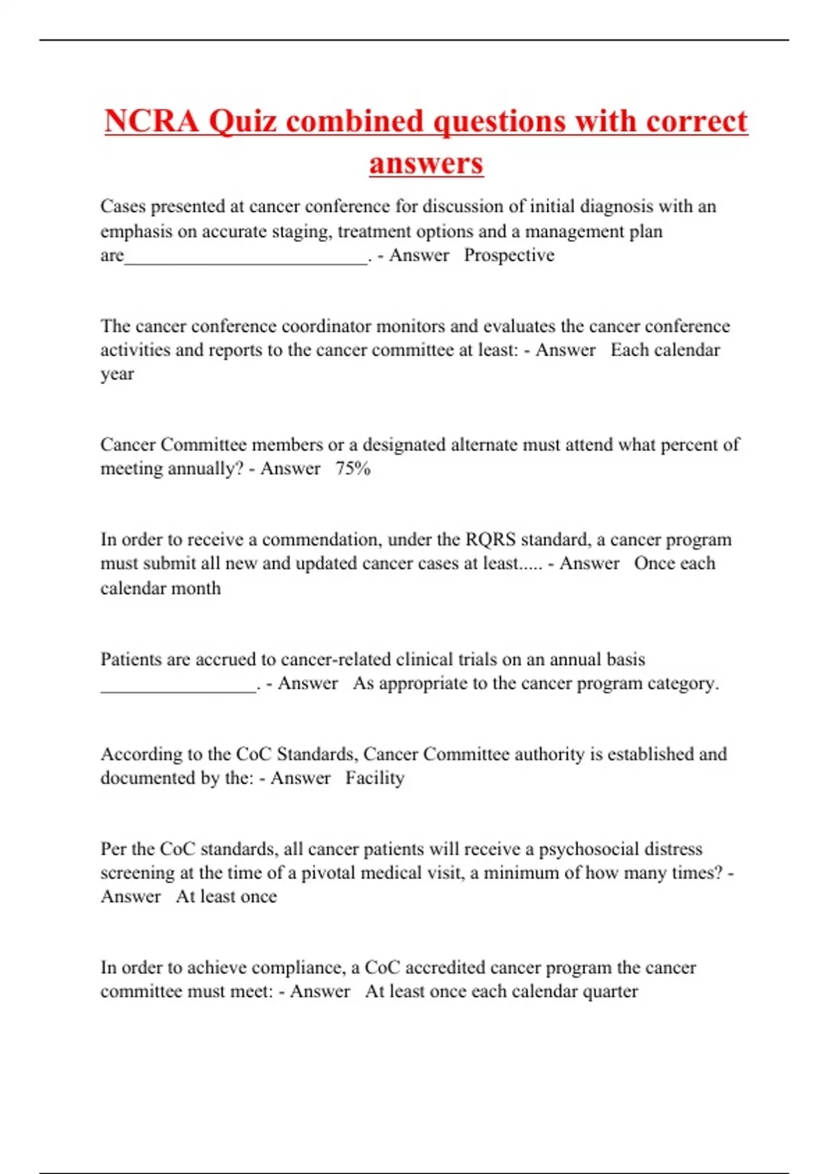 Cases presented at cancer conference for discussion of initial diagnosis with an emphasis on accurate staging, treatment options and a management plan are_________________________. - Answer Prospective The cancer conference coordinator monitors and evaluates the cancer conference activities and reports to the cancer committee at least: - Answer Each calendar year Cancer Committee members or a designated alternate must attend what percent of meeting annually? - Answer 75% In order to receive a commendation, under the RQRS standard, a cancer program must submit all new and updated cancer cases at least..... - Answer Once each calendar month Patients are accrued to cancer-related clinical trials on an annual basis ________________. - Answer As appropriate to the cancer program category. According to the CoC Standards, Cancer Committee authority is established and documented by the: - Answer Facility Per the CoC standards, all cancer patients will receive a psychosocial distress screening at the time of a pivotal medical visit, a minimum of how many times? - Answer At least once