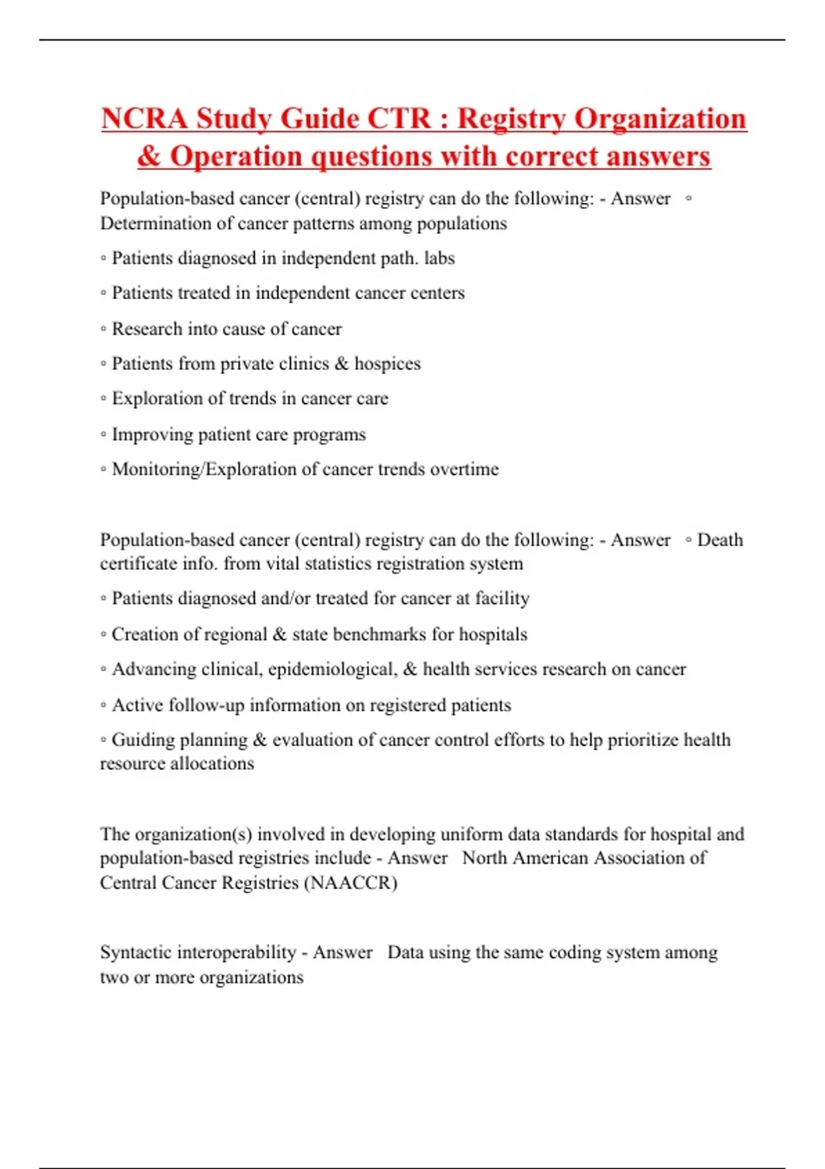 Population-based cancer (central) registry can do the following: - Answer ◦ Determination of cancer patterns among populations ◦ Patients diagnosed in independent path. labs ◦ Patients treated in independent cancer centers ◦ Research into cause of cancer ◦ Patients from private clinics & hospices ◦ Exploration of trends in cancer care ◦ Improving patient care programs ◦ Monitoring/Exploration of cancer trends overtime Population-based cancer (central) registry can do the following: - Answer ◦ Death certificate info. from vital statistics registration system ◦ Patients diagnosed and/or treated for cancer at facility ◦ Creation of regional & state benchmarks for hospitals ◦ Advancing clinical, epidemiological, & health services research on cancer ◦ Active follow-up information on registered patients ◦ Guiding planning & evaluation of cancer control efforts to help prioritize health resource allocations The organization(s) involved in developing uniform data standards for hospital and population-based registries include - Answer North American Association of Central Cancer Registries (NAACCR) Syntactic interoperability - Answer Data using the same coding system among two or more organizations