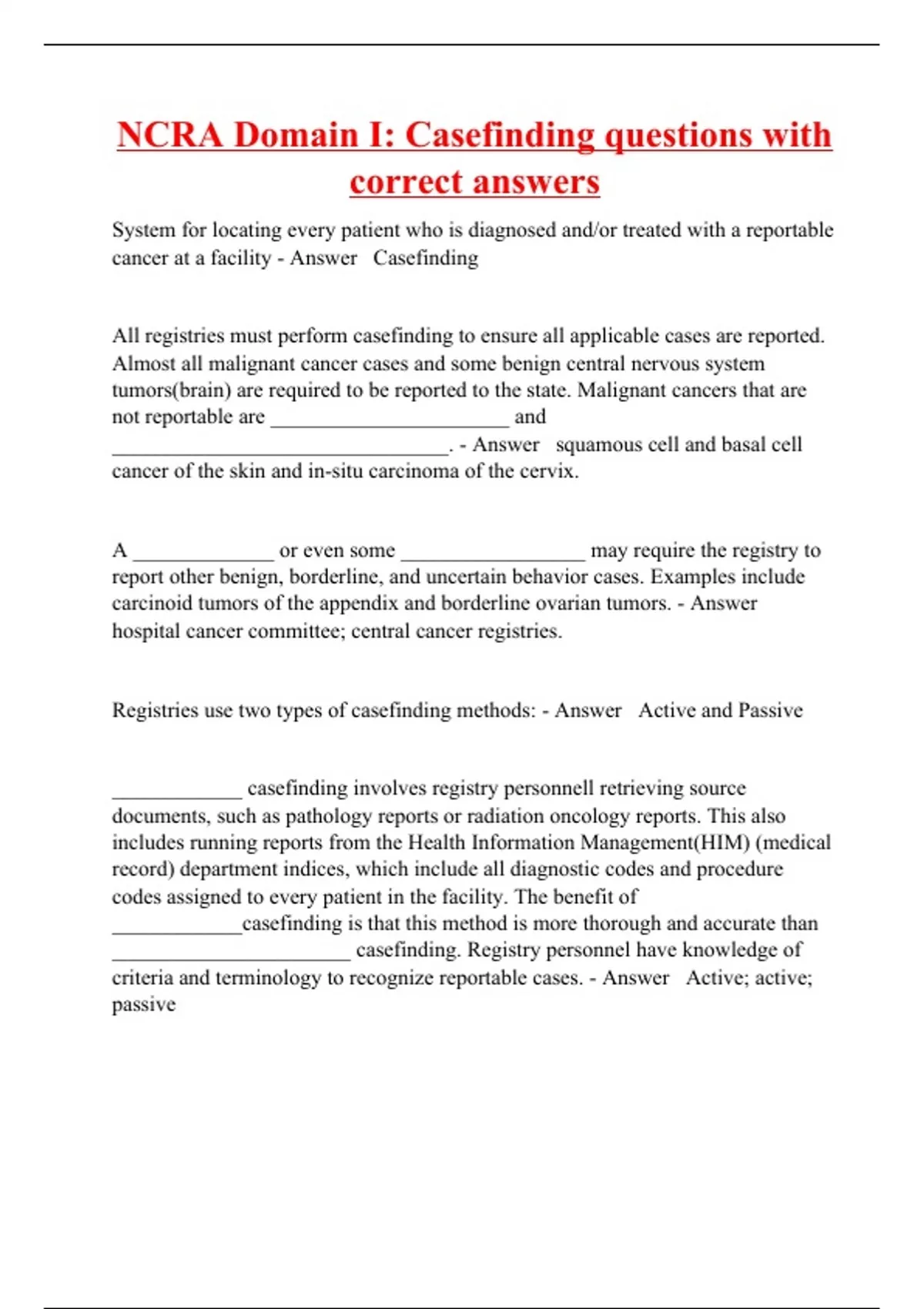 System for locating every patient who is diagnosed and/or treated with a reportable cancer at a facility - Answer Casefinding All registries must perform casefinding to ensure all applicable cases are reported. Almost all malignant cancer cases and some benign central nervous system tumors(brain) are required to be reported to the state. Malignant cancers that are not reportable are ______________________ and _______________________________. - Answer squamous cell and basal cell cancer of the skin and in-situ carcinoma of the cervix. A _____________ or even some _________________ may require the registry to report other benign, borderline, and uncertain behavior cases. Examples include carcinoid tumors of the appendix and borderline ovarian tumors. - Answer hospital cancer committee; central cancer registries.