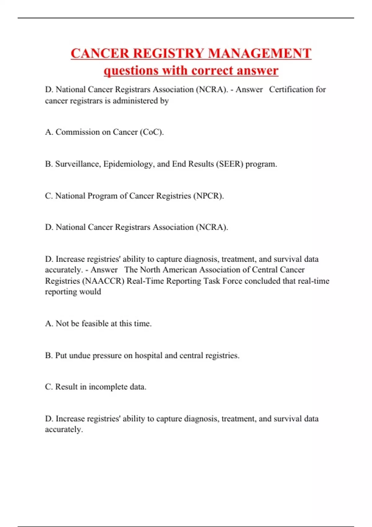 D. National Cancer Registrars Association (NCRA). - Answer Certification for cancer registrars is administered by A. Commission on Cancer (CoC). B. Surveillance, Epidemiology, and End Results (SEER) program. C. National Program of Cancer Registries (NPCR). D. National Cancer Registrars Association (NCRA). D. Increase registries' ability to capture diagnosis, treatment, and survival data accurately. - Answer The North American Association of Central Cancer Registries (NAACCR) Real-Time Reporting Task Force concluded that real-time reporting would A. Not be feasible at this time. B. Put undue pressure on hospital and central registries. C. Result in incomplete data. D. Increase registries' ability to capture diagnosis, treatment, and survival data accurately.