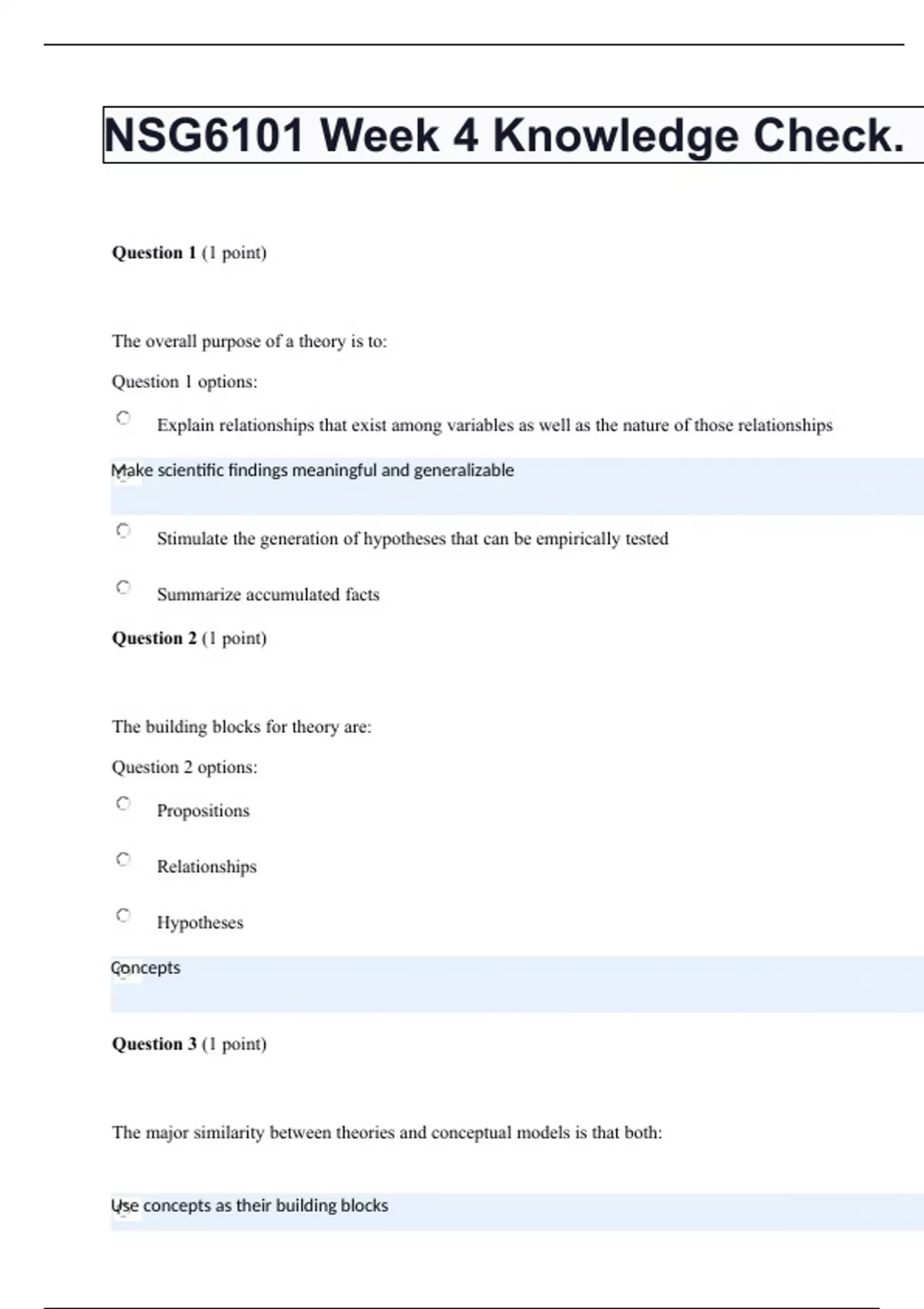 NSG6101 Week 4 Knowledge Check. Question 1 (1 point) The overall purpose of a theory is to: Question 1 options: Explain relationships that exist among variables as well as the nature of those relationships Stimulate the generation of hypotheses that can be empirically tested Summarize accumulated facts Question 2 (1 point) The building blocks for theory are: Question 2 options: Propositions Relationships Hypotheses Question 3 (1 point)