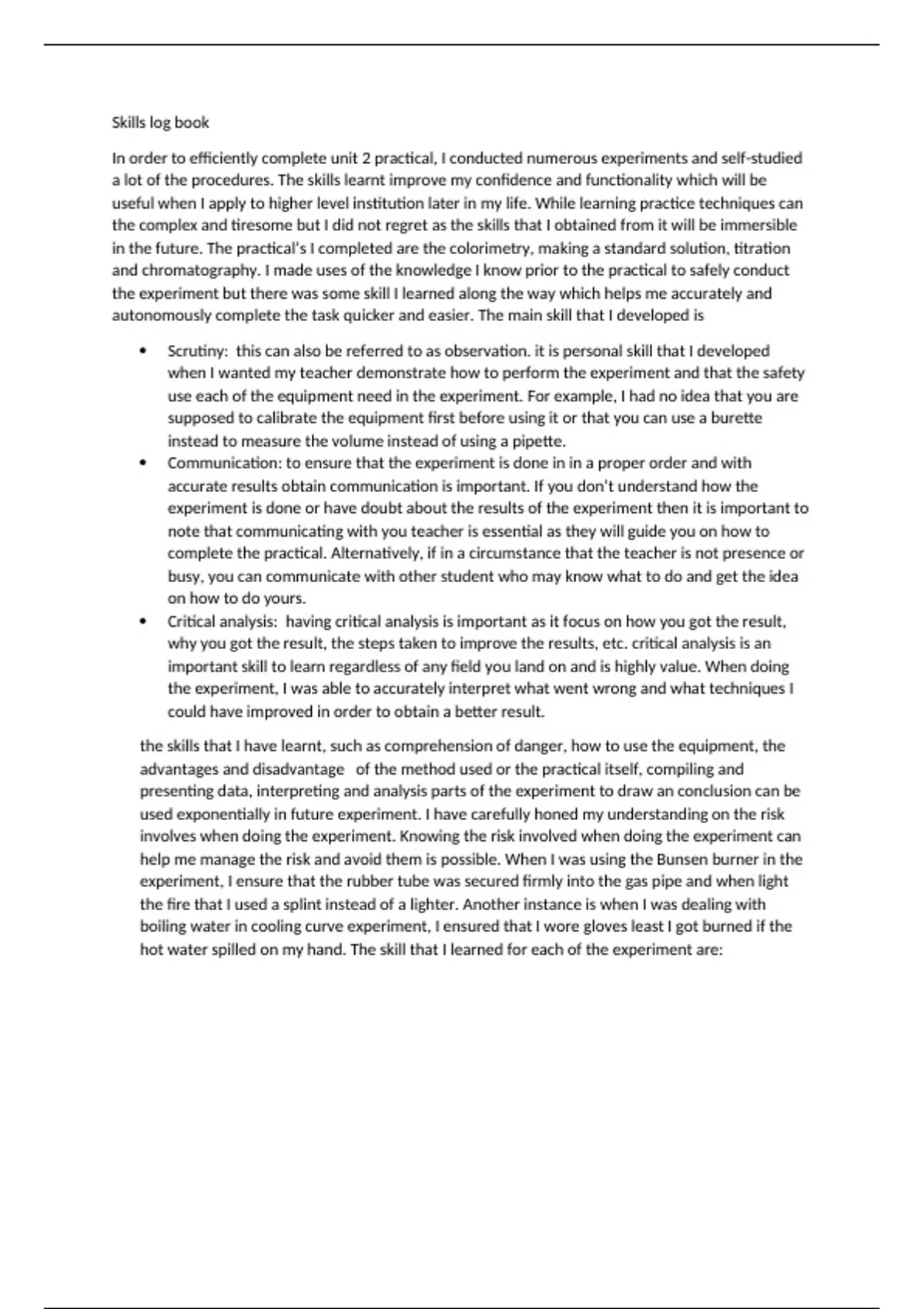 hot water spilled on my hand. The skill that I learned for each of the experiment are: