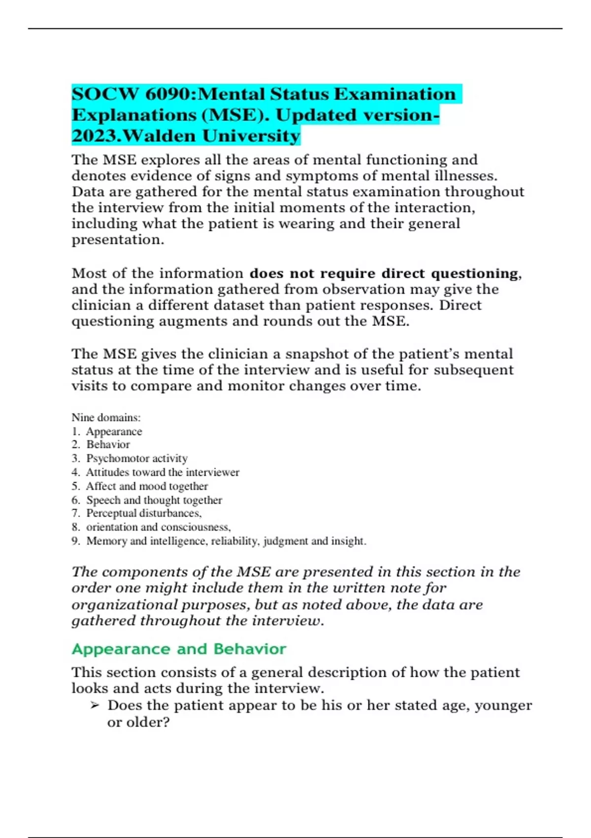 SOCW 6090:Mental Status Examination Explanations (MSE). Updated version-2023.Walden University