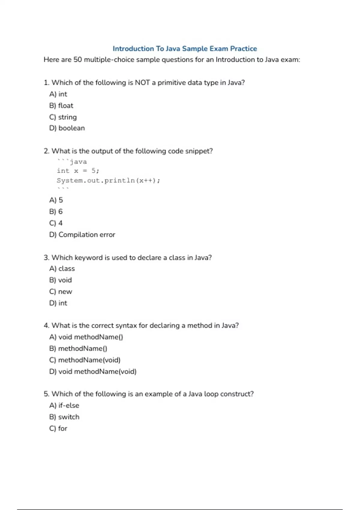The Java exam questions provided cover a range of fundamental topics in Java programming. The questions touch upon key concepts such as data types, variables, control structures, arrays, methods, classes, inheritance, exception handling, and object-oriented programming principles. The questions assess the understanding of Java syntax, the ability to write and analyze code snippets, and knowledge of various programming concepts. They also test familiarity with common programming constructs, such as loops, conditionals, and switch statements, as well as essential Java concepts like encapsulation, polymorphism, and abstraction. Additionally, the questions gauge knowledge of fundamental Java libraries and their applications, such as the Scanner class for user input and the Math class for mathematical operations. They also cover topics related to error handling and exception management, showcasing the importance of handling potential errors in Java programs. Overall, these Java exam questions aim to evaluate a student's grasp of foundational Java programming concepts, their ability to apply these concepts in practical scenarios, and their understanding of key principles and best practices in Java programming.