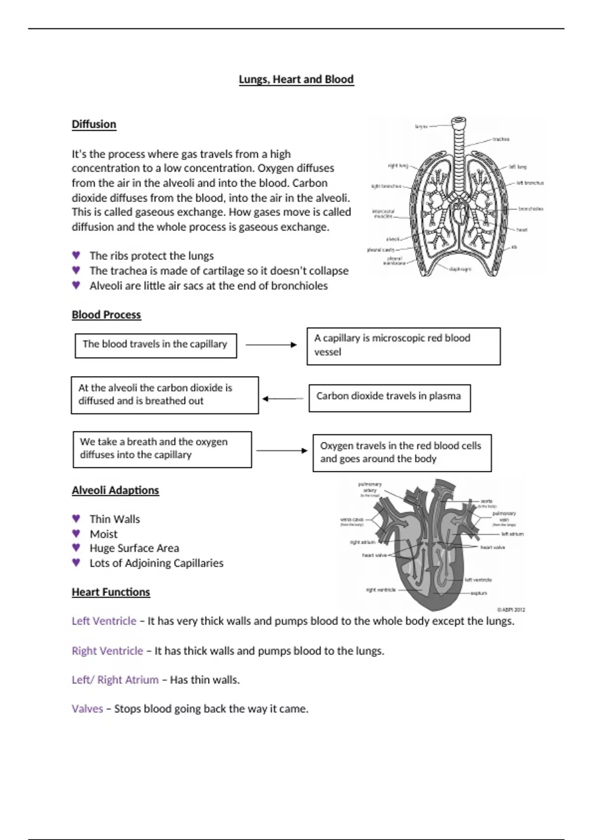 GCSE Biology Heart, Lungs and Blood Summary Notes