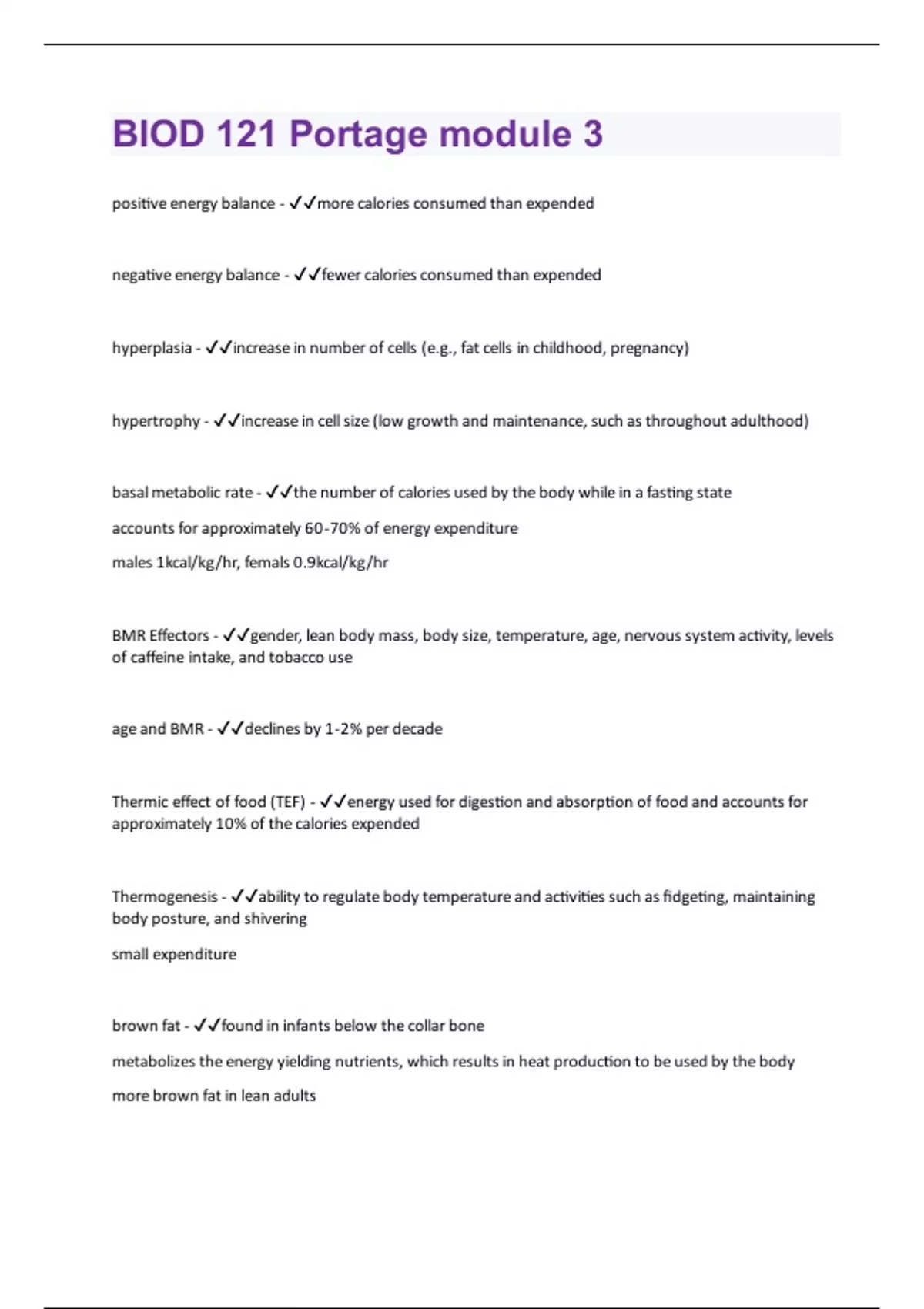 ositive energy balance - more calories consumed than expended negative energy balance - fewer calories consumed than expended hyperplasia - increase in number of cells (e.g., fat cells in childhood, pregnancy) hypertrophy - increase in cell size (low growth and maintenance, such as throughout adulthood) basal metabolic rate - the number of calories used by the body while in a fasting state accounts for approximately 60-70% of energy expenditure males 1kcal/kg/hr, femals 0.9kcal/kg/hr BMR Effectors - gender, lean body mass, body size, temperature, age, nervous system activity, levels of caffeine intake, and tobacco use age and BMR - declines by 1-2% per decade Thermic effect of food (TEF) - energy used for digestion and absorption of food and accounts for approximately 10% of the calories expended Thermogenesis - ability to regulate body temperature and activities such as fidgeting, maintaining body posture, and shivering small expenditure brown fat - found in infants below the collar bone metabolizes the energy yielding nutrients, which results in heat production to be used by the body more brown fat in lean adults
