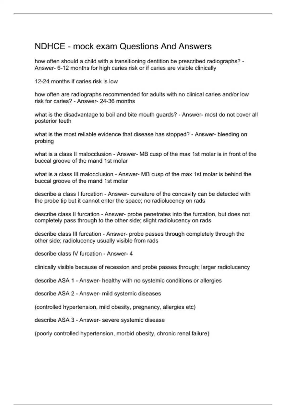 how often should a child with a transitioning dentition be prescribed radiographs? - Answer- 6-12 months for high caries risk or if caries are visible clinically 12-24 months if caries risk is low how often are radiographs recommended for adults with no clinical caries and/or low risk for caries? - Answer- 24-36 months what is the disadvantage to boil and bite mouth guards? - Answer- most do not cover all posterior teeth what is the most reliable evidence that disease has stopped? - Answer- bleeding on probing what is a class II malocclusion - Answer- MB cusp of the max 1st molar is in front of the buccal groove of the mand 1st molar what is a class III malocclusion - Answer- MB cusp of the max 1st molar is behind the buccal groove of the mand 1st molar describe a class I furcation - Answer- curvature of the concavity can be detected with the probe tip but it cannot enter the space; no radiolucency on rads describe class II furcation - Answer- probe penetrates into the furcation, but does not completely pass through to the other side; slight radiolucency on rads describe class III furcation - Answer- probe passes through completely through the other side; radiolucency usually visible from rads describe class IV furcation - Answer- 4 clinically visible because of recession and probe passes through; larger radiolucency describe ASA 1 - Answer- healthy with no systemic conditions or allergies describe ASA 2 - Answer- mild systemic diseases (controlled hypertension, mild obesity, pregnancy, allergies etc) describe ASA 3 - Answer- severe systemic disease (poorly controlled hypertension, morbid obesity, chronic renal failure)
