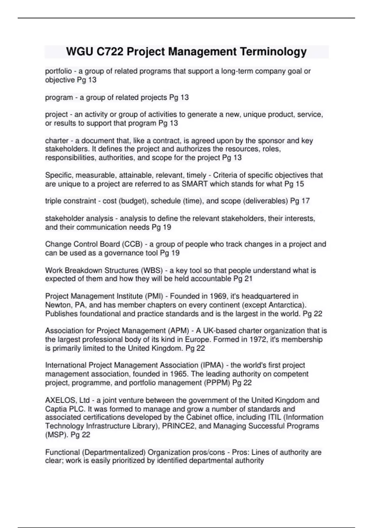 portfolio - a group of related programs that support a long-term company goal or objective Pg 13 program - a group of related projects Pg 13 project - an activity or group of activities to generate a new, unique product, service, or results to support that program Pg 13 charter - a document that, like a contract, is agreed upon by the sponsor and key stakeholders. It defines the project and authorizes the resources, roles, responsibilities, authorities, and scope for the project Pg 13 Specific, measurable, attainable, relevant, timely - Criteria of specific objectives that are unique to a project are referred to as SMART which stands for what Pg 15 triple constraint - cost (budget), schedule (time), and scope (deliverables) Pg 17 stakeholder analysis - analysis to define the relevant stakeholders, their interests, and their communication needs Pg 19 Change Control Board (CCB) - a group of people who track changes in a project and can be used as a governance tool Pg 19 Work Breakdown Structures (WBS) - a key tool so that people understand what is expected of them and how they will be held accountable Pg 21 Project Management Institute (PMI) - Founded in 1969, it's headquartered in Newton, PA, and has member chapters on every continent (except Antarctica). Publishes foundational and practice standards and is the largest in the world. Pg 22 Association for Project Management (APM) - A UK-based charter organization that is the largest professional body of its kind in Europe. Formed in 1972, it's membership is primarily limited to the United Kingdom. Pg 22 International Project Management Association (IPMA) - the world's first project management association, founded in 1965. The leading authority on competent project, programme, and portfolio management (PPPM) Pg 22 AXELOS, Ltd - a joint venture between the government of the United Kingdom and Captia PLC. It was formed to manage and grow a number of standards and associated certifications developed by the Cabinet office, including ITIL (Information Technology Infrastructure Library), PRINCE2, and Managing Successful Programs (MSP). Pg 22 Functional (Departmentalized) Organization pros/cons - Pros: Lines of authority are clear; work is easily prioritized by identified departmental authority Cons: Utilizing resources across functions can be difficult; project is not managed holistically Projectized Organization pros and cons - Pros: Clear lines of authority; project is managed holistically; gain historical data from prior projects. Cons: Approach is expensive because of the duplication of personnel; SME assigned may not have the most appropriate knowledge or expertise for the project Matrix Organization pros and cons - Pros: Central focus is the project; issues are responded to quickly. Cons: Requires cooperation and coordination between and among functional departments and project managers; resource balancing between projects can lead to friction. project management office (PMO) - A process for determining if the level of documentation and best practices followed in project execution. Pg 26 Project Management Maturity Level - Determined by the comprehensiveness of written procedures to accomplish tasks in each of the process areas identified by PMI. Pg 26 alignment - Term used to describe connecting project outcomes to company goals. Pg 30 Realistic - Model is appropriate to the level of resources available, the operating environment, and capabilities of the company. Pg 31 Capable - The model is able to apply the pertinent factors of the evaluation, including time, risk, cost, and internal and external environment. Pg 31 Flexible - Model should provide accurate measures across a reasonable range of changing conditions. Pg 31 Easy to use - The model is not difficult to learn and understand in a relatively short time; provides results readily understandable to the user.. Pg 31 Low Cost - Cost to run the model is economical relative to scale (budget) of project Pg 31 Comparable - The model should be usable across a multitude of projects, and not be project specific. Pg 31 Non-numeric project selection models - A process of selecting projects; not limited to traditional numeric performance measures; includes Competitive Necessity, Operating Necessity, Sacred Cow, and Checklist.