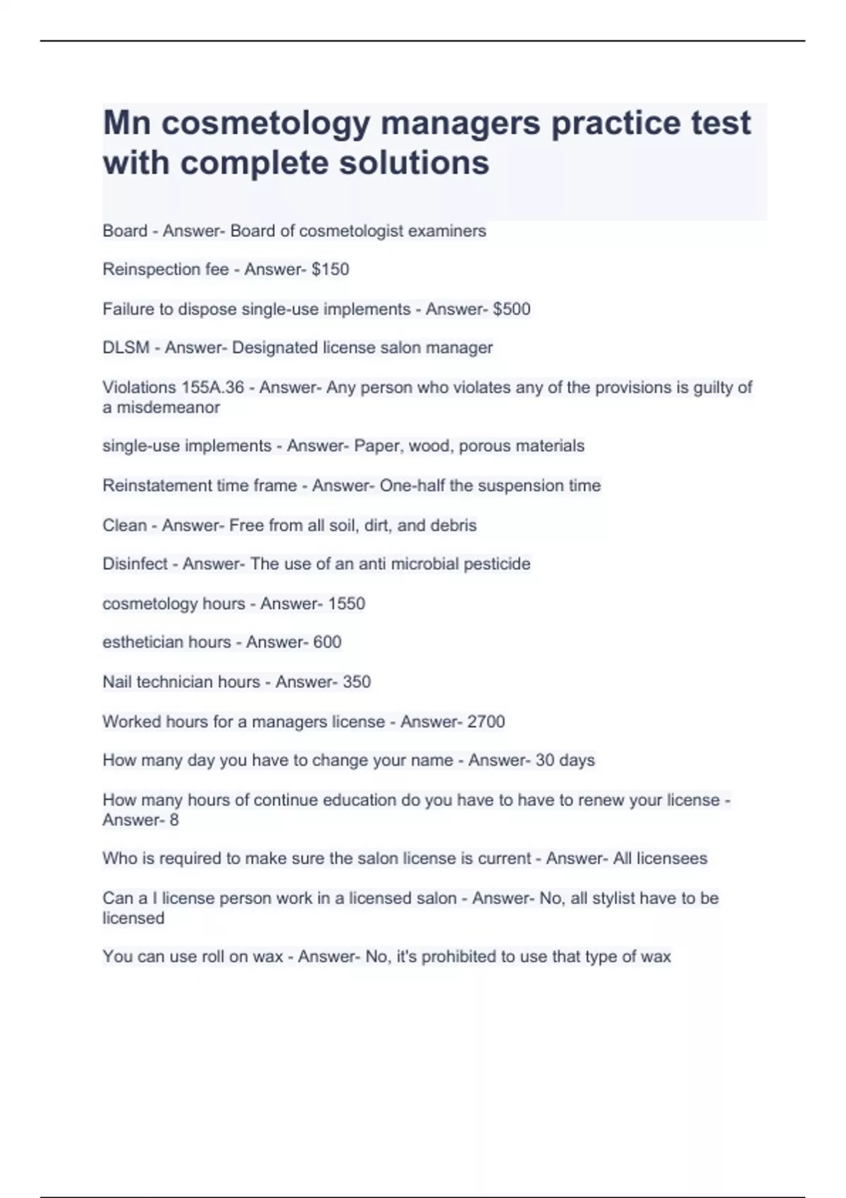 Board - Answer- Board of cosmetologist examiners Reinspection fee - Answer- $150 Failure to dispose single-use implements - Answer- $500 DLSM - Answer- Designated license salon manager Violations 155A.36 - Answer- Any person who violates any of the provisions is guilty of a misdemeanor single-use implements - Answer- Paper, wood, porous materials Reinstatement time frame - Answer- One-half the suspension time Clean - Answer- Free from all soil, dirt, and debris Disinfect - Answer- The use of an anti microbial pesticide cosmetology hours - Answer- 1550 esthetician hours - Answer- 600 Nail technician hours - Answer- 350 Worked hours for a managers license - Answer- 2700 How many day you have to change your name - Answer- 30 days How many hours of continue education do you have to have to renew your license - Answer- 8 Who is required to make sure the salon license is current - Answer- All licensees Can a I license person work in a licensed salon - Answer- No, all stylist have to be licensed You can use roll on wax - Answer-