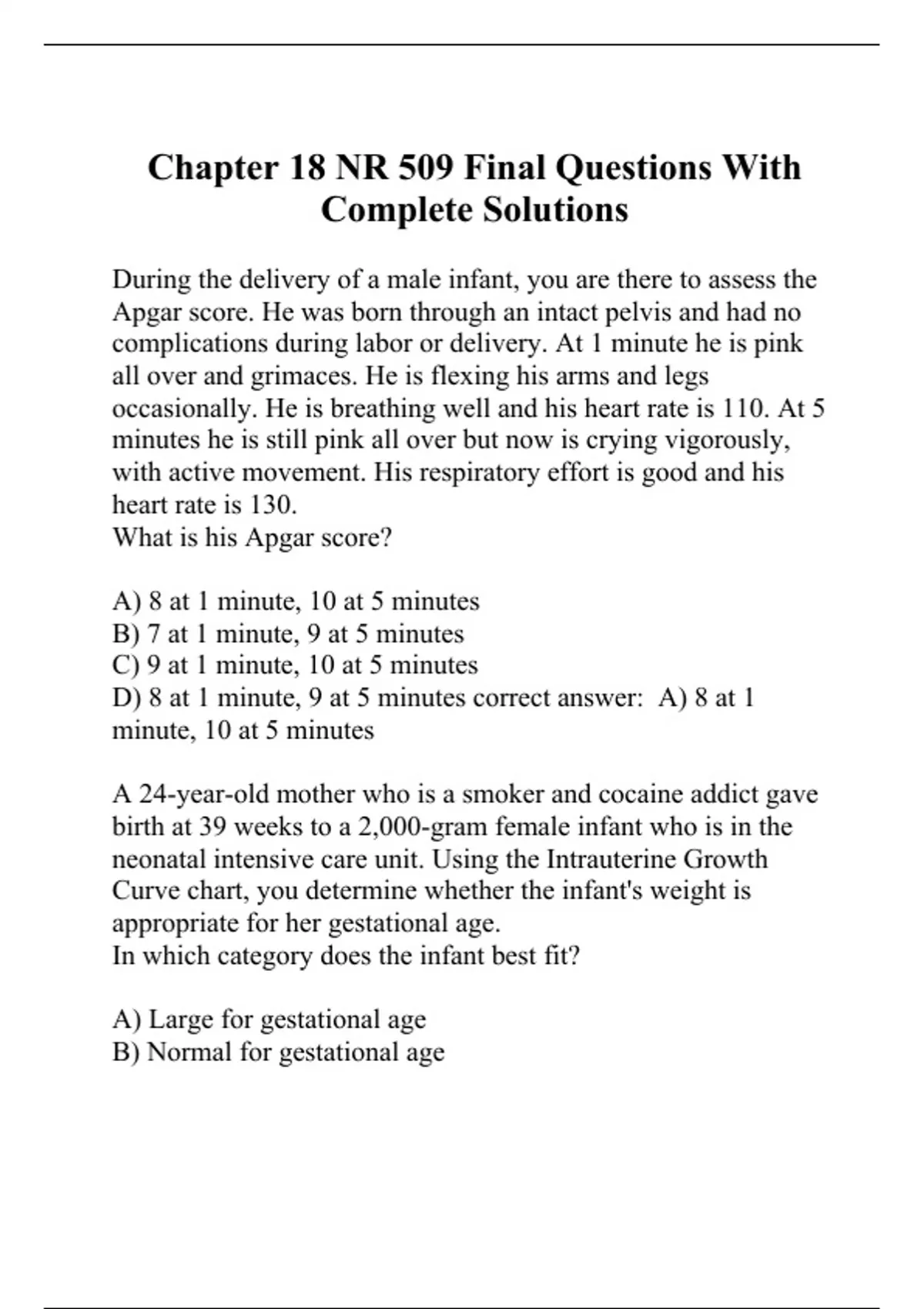 During the delivery of a male infant, you are there to assess the Apgar score. He was born through an intact pelvis and had no complications during labor or delivery. At 1 minute he is pink all over and grimaces. He is flexing his arms and legs occasionally. He is breathing well and his heart rate is 110. At 5 minutes he is still pink all over but now is crying vigorously, with active movement. His respiratory effort is good and his heart rate is 130. What is his Apgar score? A) 8 at 1 minute, 10 at 5 minutes B) 7 at 1 minute, 9 at 5 minutes C) 9 at 1 minute, 10 at 5 minutes D) 8 at 1 minute, 9 at 5 minutes correct answer: A) 8 at 1 minute, 10 at 5 minutes A 24-year-old mother who is a smoker and cocaine addict gave birth at 39 weeks to a 2,000-gram female infant who is in the neonatal intensive care unit. Using the Intrauterine Growth Curve chart, you determine whether the infant's weight is appropriate for her gestational age. In which category does the infant best fit? A) Large for gestational age B) Normal for gestational age C) Small for gestational age correct answer: C) Small for gestational age
