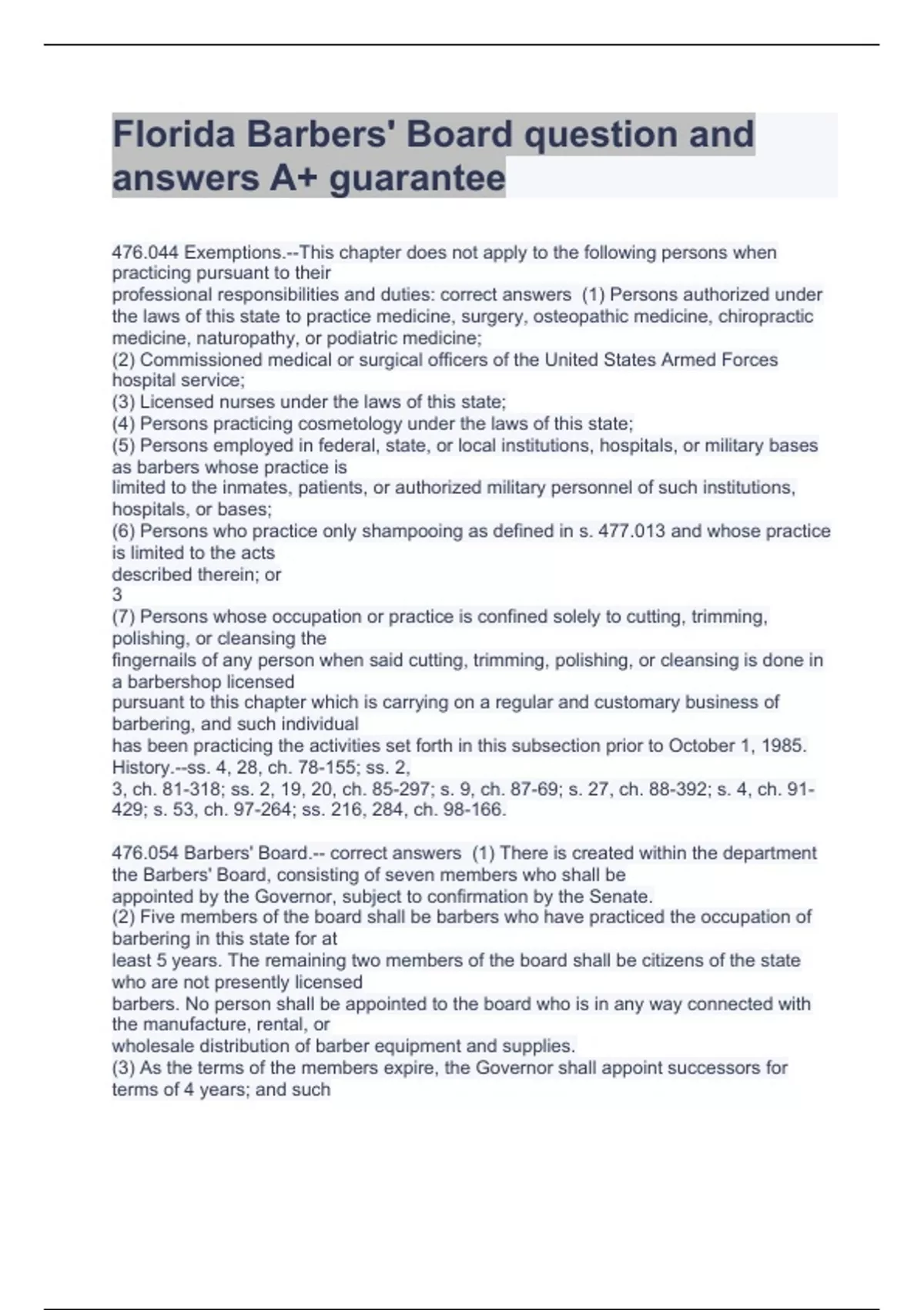 Florida Barbers' Board question and answers A+ guarantee 476.044 Exemptions.--This chapter does not apply to the following persons when practicing pursuant to their professional responsibilities and duties: (1) Persons authorized under the laws of this state to practice medicine, surgery, osteopathic medicine, chiropractic medicine, naturopathy, or podiatric medicine; (2) Commissioned medical or surgical officers of the United States Armed Forces hospital service; (3) Licensed nurses under the laws of this state; (4) Persons practicing cosmetology under the laws of this state; (5) Persons employed in federal, state, or local institutions, hospitals, or military bases as barbers whose practice is limited to the inmates, patients, or authorized military personnel of such institutions, hospitals, or bases; (6) Persons who practice only shampooing as defined in s. 477.013 and whose practice is limited to the acts described therein; or 3 (7) Persons whose occupation or practice is confined solely to cutting, trimming, polishing, or cleansing the fingernails of any person when said cutting, trimming, polishing, or cleansing is done in a barbershop licensed pursuant to this chapter which is carrying on a regular and customary business of barbering, and such individual has been practicing the activities set forth in this subsection prior to October 1, 1985. History.--ss. 4, 28, ch. 78-155; ss. 2, 3, ch. 81-318; ss. 2, 19, 20, ch. 85-297; s. 9, ch. 87-69; s. 27, ch. 88-392; s. 4, ch. 91-429; s. 53, ch. 97-264; ss. 216, 284, ch. 98-166. 476.054 Barbers' Board.-- (1) There is created within the department the Barbers' Board, consisting of seven members who shall be appointed by the Governor, subject to confirmation by the Senate. (2) Five members of the board shall be barbers who have practiced the occupation of barbering in this state for at least 5 years. The remaining two members of the board shall be citizens of the state who are not presently licensed barbers. No person shall be appointed to the board who is in any way connected with the manufacture, rental, or wholesale distribution of barber equipment and supplies. (3) As the terms of the members expire, the Governor shall appoint successors for terms of 4 years; and such members shall serve until their successors are appointed and qualified. The Governor may remove any member for cause. (4) No person shall be appointed to serve more than two consecutive terms. Any vacancy shall be filled by appointment by the Governor for the unexpired portion of the term. (5) Each board member shall receive per diem and mileage allowances as provided in s. 112.061 from the place of her or his residence to the place of meeting and the return therefrom. (6) Each board member shall be held accountable to the Governor for the proper performance of all duties and obligations of such board member's office. The Governor shall cause to be investigated any complaints or unfavorable reports received concerning the actions of the board or its individual members and shall take appropriate action thereon, which may include removal of any board member for malfeasance, misfeasance, neglect of duty, commission of a felony, drunkenness, incompetency, or permanent inability to perform her or his official duties. History.--ss. 5, 28, ch. 78-155; ss. 3, 13, 15, 25, 30, 34, 62, ch. 80-406; ss. 2, 3, ch. 81-318; ss. 3, 19, 20, ch. 85-297; s. 4, ch. 91-429; s. 165, ch. 94-218; s. 394, ch. 97-103. 476.064 Organization; headquarters; personnel; meetings.-- (1) The board shall annually elect a chair and a vice chair from its number. The board shall maintain its headquarters in Tallahassee. (2) The department shall appoint or employ such personnel as may be necessary to assist the board in exercising the powers and performing the duties and obligations set forth in this act. Such personnel need not be licensed barbers and shall not be members of the board. Such personnel shall be authorized to do and perform such duties and work as may be assigned by the board. (3) The board shall hold an annual meeting and such other meetings during the year as it may determine to be necessary. The chair of the board may call other meetings at her or his discretion. A quorum of the board shall consist of not less than four members. (4) The board has authority to adopt rules pursuant to ss. 120.536(1) and 120.54 to implement the provisions of this chapter. History.--ss. 6, 28, ch. 78-155; ss. 4, 13, 15, 25, 30, 34, 62, ch. 80-406; ss. 2, 3, ch. 81-318; ss. 4, 19, 20, ch. 85-297; s. 4, ch. 91-429; s. 395, ch. 97-103; s. 148, ch. 98-200 476.074 Legal, investigative, and inspection services.-- (1) The department shall provide all legal services needed to carry out the provisions of this act. (2) The department shall provide all investigative services required by the board or the department in carrying out the provisions of this act. (3) The department shall provide all inspection services. History.--ss. 6, 7, 28, ch. 78-155; ss. 5, 13, 15, 25, 30, 34, 62, ch. 80-406; ss. 2, 3, ch. 81-318; ss. 19, 20, ch. 85-297; s. 4, ch. 91-429. 476.114 Examination; prerequisites.-- (1) A person desiring to be licensed as a barber shall apply to the department for licensure. (2) An applicant shall be eligible for licensure by examination to practice barbering if the applicant: (a) Is at least 16 years of age; (b) Pays the required application fee; and (c)1. Holds an active valid license to practice barbering in another state, has held the license for at least 1 year, and does not qualify for licensure by endorsement as provided for in s. 476.144(5); or 2. Has received a minimum of 1,200 hours of training as established by the board, which shall include, but shall not be limited to, the equivalent of completion of services directly related to the practice of barbering at one of the following: a. A school of barbering licensed pursuant to chapter 1005; b. A barbering program within the public school system; or 4 c. A go