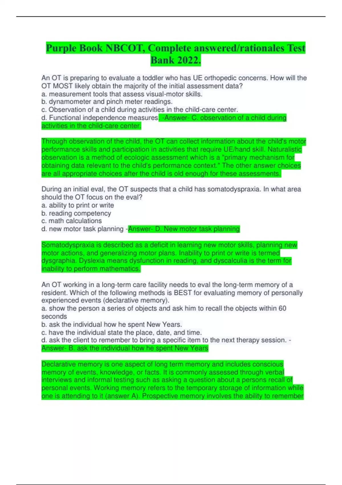 Purple Book NBCOT, Complete answered/rationales Test Bank 2023