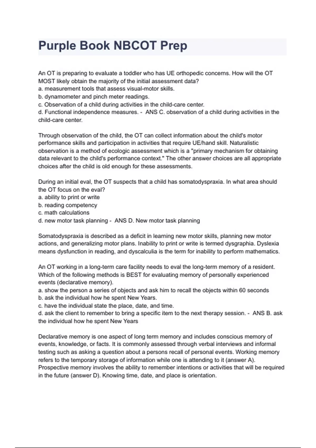 Purple Book NBCOT, Complete answered/rationales Test Bank 2022 An OT is preparing to evaluate a toddler who has UE orthopedic concerns. How will the OT MOST likely obtain the majority of the initial assessment data? a. measurement tools that assess visual-motor skills. b. dynamometer and pinch meter readings. c. Observation of a child during activities in the child-care center. d. Functional independence measures. - ANS C. observation of a child during activities in the child-care center. Through observation of the child, the OT can collect information about the child's motor performance skills and participation in activities that require UE/hand skill. Naturalistic observation is a method of ecologic assessment which is a "primary mechanism for obtaining data relevant to the child's performance context." The other answer choices are all appropriate choices after the child is old enough for these assessments. During an initial eval, the OT suspects that a child has somatodyspraxia. In what area should the OT focus on the eval? a. ability to print or write b. reading competency c. math calculations d. new motor task planning - ANS D. New motor task planning Somatodyspraxia is described as a deficit in learning new motor skills, planning new motor actions, and generalizing motor plans. Inability to print or write is termed dysgraphia. Dyslexia means dysfunction in reading, and dyscalculia is the term for inability to perform mathematics. An OT working in a long-term care facility needs to eval the long-term memory of a resident. Which of the following methods is BEST for evaluating memory of personally experienced events (declarative memory). a. show the person a series of objects and ask him to recall the objects within 60 seconds b. ask the individual how he spent New Years. c. have the individual state the place, date, and time. d. ask the client to remember to bring a specific item to the next therapy session. - ANS B. ask the individual how he spent New Years Declarative memory is one aspect of long term memory and includes conscious memory of events, knowledge, or facts. It is commonly assessed through verbal interviews and informal testing such as asking a question about a persons recall of personal events. Working memory refers to the temporary storage of information while one is attending to it (answer A). Prospective memory involves the ability to remember intentions or activities that will be required in the future (answer D). Knowing time, date, and place is orientation. A child avoids playground equipment that requires her feet to be off the ground. What does this behavior MOST likely indicate? a. difficulty modulating proprioception b. somatodyspraxia c. gravitational insecurity d. bilateral integration/sequencing deficits. - ANS C. Gravitational insecurity. gravitational insecurity is described as fear response to movement. Tactile defensiveness (answer A) is a term used to describe discomfort with various textures with unexpected touch. Somatodyspraxia interferes with development of bodyscheme and awareness. Bilateral integration relates to ability to coordinate, sequence, and execute motor actions quickly and efficiently. When the OT suspects tactile defensiveness as a rational for a child's challenges, in what area of participation should the OT focus on FIRST? a. play behavior b. dressing habits c. social skills d. leisure interests - ANS b. dressing habits Children with tactile defensiveness are bothered by tactile aspects of ADLs including specific types of clothing. The child may avoid wearing certain clothes. Conversely, some children may never take their shoes off to avoid tactile stimulation. Play behavior and social skills could be affected secondarily as a result of intolerance to certain textures or human touch. Knowledge of the child's dressing habits will give the OT key information at the start of the evaluation process. An OT is working with an individual with schizophrenia who is in the
