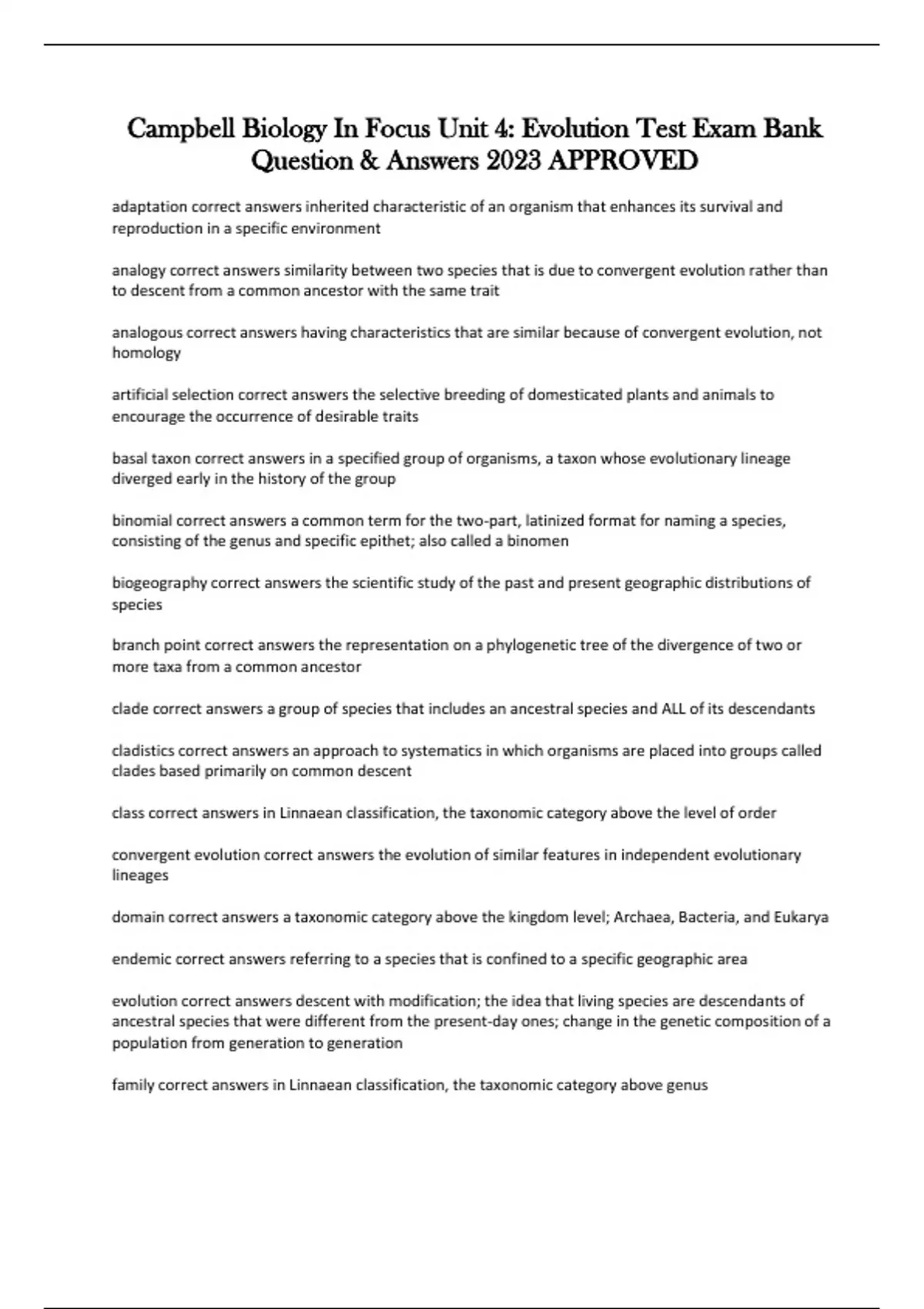 Campbell Biology In Focus Unit 4: Evolution Test Exam Bank Question & Answers 2023 APPROVED adaptation correct answers inherited characteristic of an organism that enhances its survival and reproduction in a specific environment analogy correct answers similarity between two species that is due to convergent evolution rather than to descent from a common ancestor with the same trait analogous correct answers having characteristics that are similar because of convergent evolution, not homology artificial selection correct answers the selective breeding of domesticated plants and animals to encourage the occurrence of desirable traits basal taxon correct answers in a specified group of organisms, a taxon whose evolutionary lineage diverged early in the history of the group binomial correct answers a common term for the two-part, latinized format for naming a species, consisting of the genus and specific epithet; also called a binomen biogeography correct answers the scientific study of the past and present geographic distributions of species branch point correct answers the representation on a phylogenetic tree of the divergence of two or more taxa from a common ancestor clade correct answers a group of species that includes an ancestral species and ALL of its descendants cladistics correct answers an approach to systematics in which organisms are placed into groups called clades based primarily on common descent class correct answers in Linnaean classification, the taxonomic category above the level of order convergent evolution correct answers the evolution of similar features in independent evolutionary lineages domain correct answers a taxonomic category above the kingdom level; Archaea, Bacteria, and Eukarya endemic correct answers referring to a species that is confined to a specific geographic area evolution correct answers descent with modification; the idea that living species are descendants of ancestral species that were different from the present-day ones; change in the genetic composition of a population from generation to generation family correct answers in Linnaean classification, the taxonomic category above genus fossil correct answers a preserved remnant or impression of an organism that lived in the past genus correct answers a taxonomic category above the species level, designated by the first word of a species' two-part scientific name homologous structures correct answers structures in different species that are similar because of common ancestry homology correct answers similarity in characteristics resulting from a shared ancestry homoplasies correct answers a similar (analogous) structure or molecular sequence that has evolved independently in two species horizontal gene transfer correct answers transfer of genes from one genome to another through mechanisms such as plasmid exchange ingroup correct answers a species or a group of species whose evolutionary relationships are being examined in a given analysis kingdom correct answers taxonomic category, second broadest after domain maximum parsimony correct answers principle that states when considering multiple explanations for an observation, one should investigate the simplest that is consistent with the fatcs molecular clock correct answers a method for estimating the time required for a given amount of evolutionary change monophyletic correct answers pertaining to a group of taxa that consists of common ancestor and all of its descendants; equivalent to a clade natural selection correct answers process in which individuals that have certain inherited traits tend to survive and reproduce at higher rates than other individuals because of those traits order correct answers in linnaean classification, the taxonomic category above the level of family outgroup correct answers a species or group of species from an evolutionary lineage that is known to have diverged before the lineage that contains the group of species being studied paleontology correct answers scientific study of fossils Pangaea correct answers supercontinent formed near the end of the Paleozoic era paraphyletic correct answers pertaining to a group of taxa that consists of a common ancestor and some, but NOT ALL, of its descendants phylum correct answers taxonomic category above class