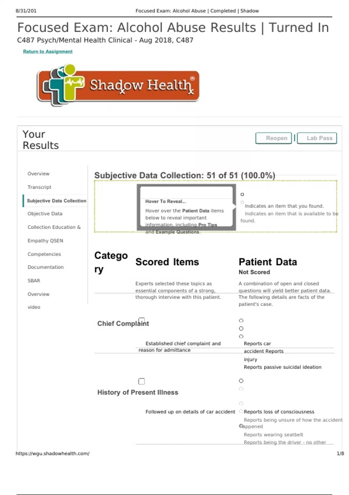 Focused Exam: Alcohol Abuse Results | Turned In C487 Psych/Mental Health Clinical - Aug 2023, C487