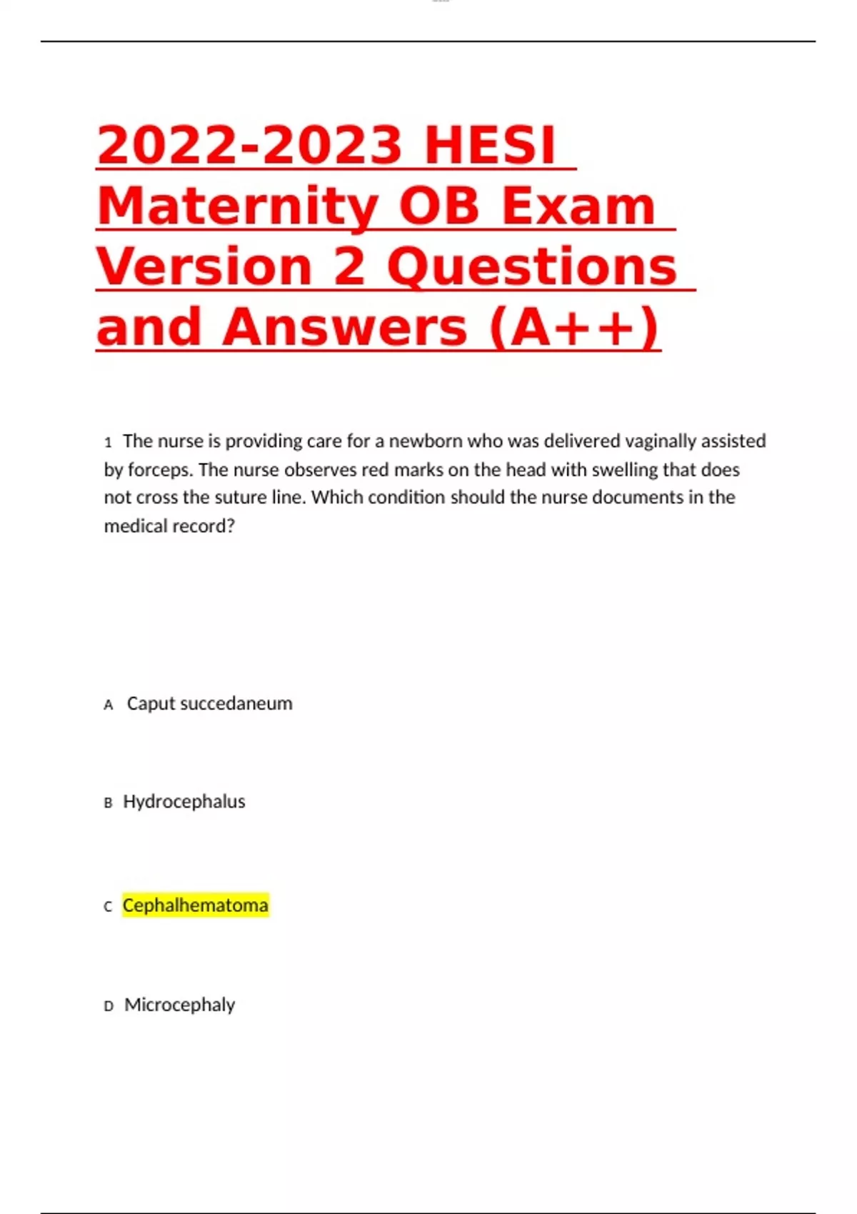 2022/2023 HESI Maternity OB Exam Version 2 Questions and Answers (A++) 1 The nurse is providing care for a newborn who was delivered vaginally assisted by forceps. The nurse observes red marks on the head with swelling that does not cross the suture line. Which condition should the nurse documents in the medical record? A Caput succedaneum B Hydrocephalus C Cephalhematoma D Microcephaly 2 A client at 34 weeks gestation comes to the birthing center complaining of vaginal bleeding that began one hour ago. The nurse assessment reveals approximately 30ML of bright red vaginal bleeding. Fetal rate of 130 - 140 beats per minute, no contractions and no complaints of pain what is the most likely cause of these client's bleeding. A Abruptio Placenta B Placenta Previa C Normal bloody show indicting induction of labor D A ruptured blood vessel in the vaginal vault. 3 A client at 30 weeks gestation reports that she has not felt the baby move in the last 24 hours. Concerned she arrives in a panic at the obstetric clinic where she is immediately sent to the hospital. which assessment warrants immediate intervention by the nurse. A Fetal Heart rate 60 beats per minute B Ruptured amniotic membrane C onset of uterine contractions D leaking amniotic fluid. 4 A client at 37 weeks gestation presents to labor and delivery with contractions every two minutes the nurse observes several shallow small vesicles on her pubis labia and perineum. the nurse should recognize the clients is prohibiting symptoms of which condition? A Genital Warts B Syphilis C Herpes Simplex Virus D German Measles 5 The nurse is planning care for a client at 30 weeks gestation who is experiencing preterm labor which maternity description is most important in preventing this fetus from developing respiratory distress syndrome. A Ampicillin 1 gram IV push q8h B Betamethasone 12 mg deep IM C Terbutaline 0.25 mg subcutaneously q 15 minutes X 3 D Butorphanol tartrate 1mg IV push q2h PRN. 6 A 16 year old gravida 1 para 0 client has just been admitted to the hospital with a diagnosis of eclampsia. She's not presently convulsing. Which intervention should the nurse plan to include in this client's nursing care plan? A Allow liberal family visitation B Keep an airway at the bedside C Assess temperature every hour D Monitor blood pressure, pulse, and respiration every 4 hours. 7 At 12 hours after the birth of a healthy infant the mother complains of feeling constant vaginal pressure. The nurse determines the fundus is firm and at midline with moderate rubra lochia. which action should nurse take? A Check the suprapubic area for distention. B Inform the client to take a warm sitz bath C Inspect clients perineal and rectal areas D Apply a fresh pad and check in 1 hour. 8 If primigravida at 36 weeks gestation who is RH negative experienced abdominal trauma in a motor vehicle collision. Which assessment finding is most important for the nurse to report to the health care provider? A Fetal heart rate at 162 beats /minute B Mild contractions every 10 minutes. C Trace of protein in the urine D. Positive fetal hemoglobin testing 9 In The Ballard Gestational Age Assessment Tool, the nurse determines that a 15-month-old infant as a gestational age of 42 weeks. Based on this finding which intervention is most important for the nurse to implement. A Provide blow by oxygen B Provide a capillary blood glucose C draw arterial blood gases D Apply a pulse oximeter to the foot. 10 A new mother who is a lacto-ovo vegetarian plans to breast feed her infant. which information should the nurse provide prior to discharge. A Continue prenatal vitamins with B12 While breastfeeding B Avoid using Lanolin-based nipple cream or ointment. C Offer iron fortified supplemental formula daily. D Weigh the baby weekly to evaluate the newborns growth. 11 What should be the primary focus of nursing care in the transitional phase of Labor for a client who anticipates an unmedicated delivery. A Assessing the strength of uterine contractions B Re-evaluate the need for medication C Remind her to push 3 times with each contraction. D Assessing her to maintain control. 12 A care provider prescribes a maintenance dose of magnesium sulfate 2 grams per hour intravenously for clients with preeclampsia. The IV bag contains magnesium sulfate 20 grams how much in ml/Hr. should a nurse program the infusion pump enter numerical value only. if the IV bag is 1000 ml the answer is 100 ml per hour 13 *A client at 38 weeks gestation is admitted to labor and delivery with a complaint of contraction 5 minutes apart while the client is in the bathroom changing into a hospital gown the nurse hears the noise of a baby what should the nurse take first? A Push the call light for help B Inspect the clients perineum C Notify a health care provider D Turn on the infant warmer 14 The nurse is caring for a multiparous client who is 8 centimeters dilated 100% effaced and the fetal head is at 0 station. The clients is shivering and states extreme discomfort with the urge to bear down. which intervention should the nurse implement? A Administer IV pain medication B Perform a vaginal exam C Reposition to side lying D Encourage pushing with each contraction. 15 Following a traumatic delivery an infant receives an initial Apgar score of 3. which intervention is most important for the nurse to implement? A Page the pediatrician STAT B Continue resuscitative efforts C Repeat the Apgar assessment in 5 minutes D Inform the parents of the infant's condition. 16 A 3-hour old male infants hands and feet as cyanotic, and has an axillary temperature of 96.5 degrees Fahrenheit 35.8 degrees centigrade a respiratory rate of 40 breaths per minute and a heart rate of 165 beats per minute what nursing action should nurse implement. A Administer oxygen by mouth at 2L/min B Gradually warm the infant under a radiant heat source. C Notify the pediatrician of the infant's vital signs D Perform a heel-stick to maintain blood glucose level 17
