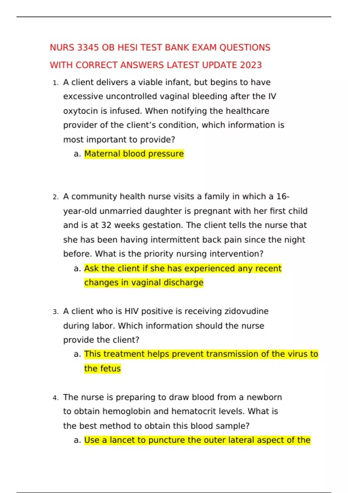 NURS 3345 OB HESI TEST BANK EXAM QUESTIONS WITH CORRECT ANSWERS LATEST UPDATE 2023