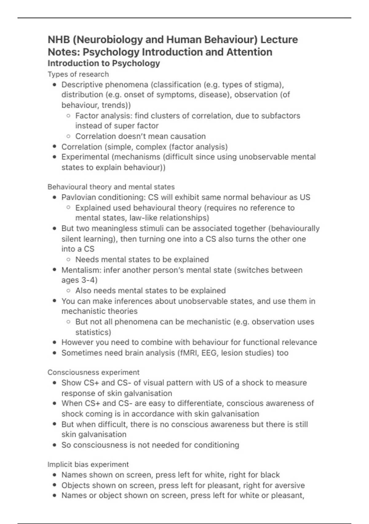 University of Cambridge (Medicine 1st class): Summary of key points of NHB (Neurobiology and Human Behaviour) Introduction to Psychology and Attention lectures for 2nd year.