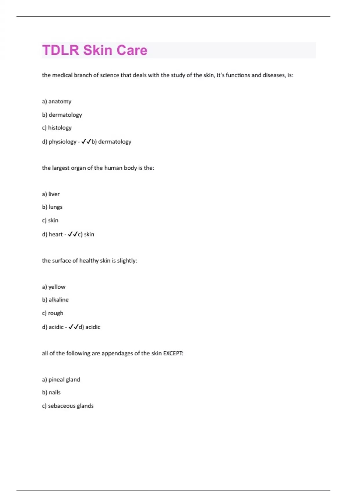 the medical branch of science that deals with the study of the skin, it's functions and diseases, is: a) anatomy b) dermatology c) histology d) physiology - b) dermatology the largest organ of the human body is the: a) liver b) lungs c) skin d) heart - c) skin the surface of healthy skin is slightly: a) yellow b) alkaline c) rough d) acidic - d) acidic all of the following are appendages of the skin EXCEPT: a) pineal gland b) nails c) sebaceous glandsd) hair - a) pineal gland