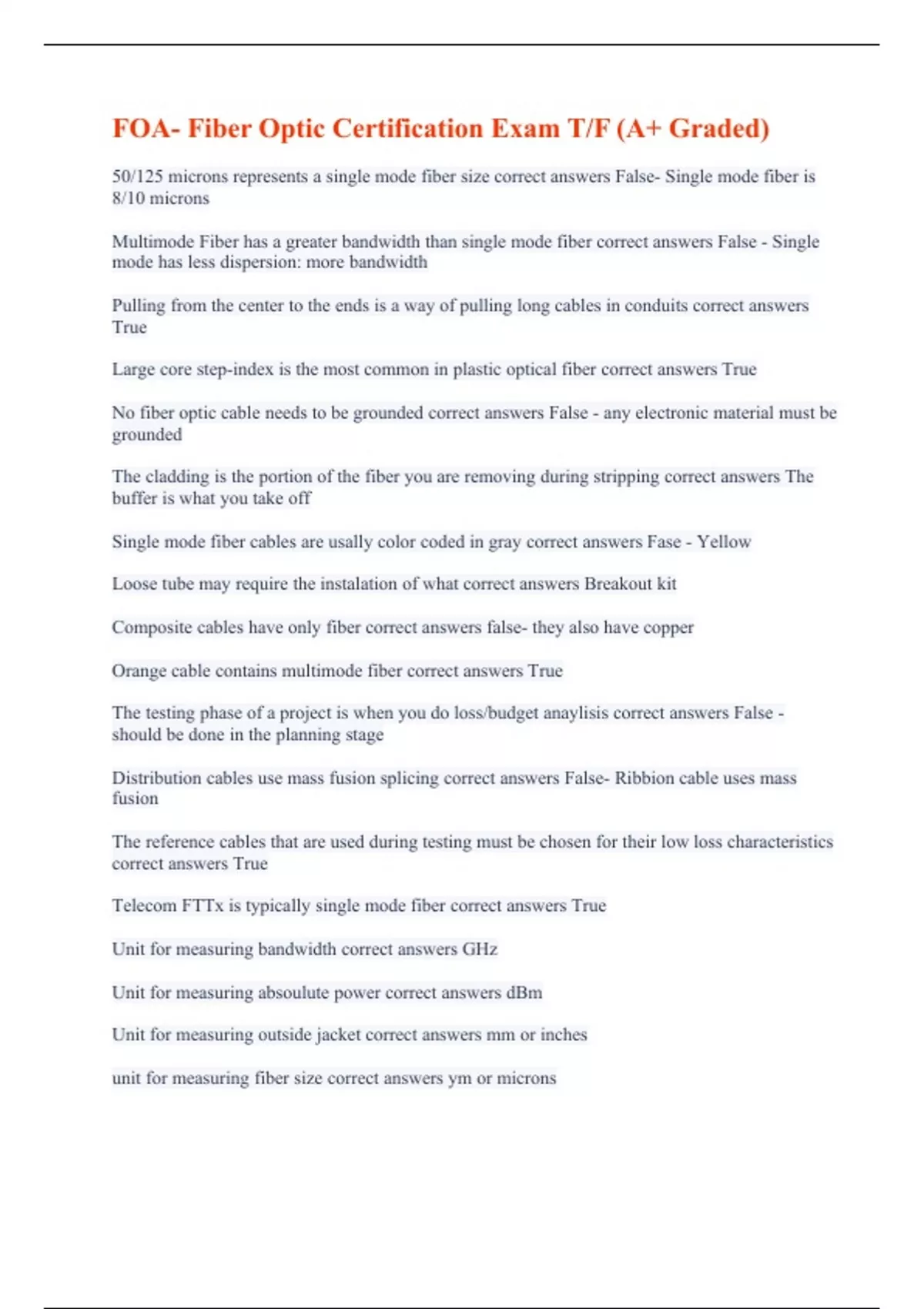 FOA- Fiber Optic Certification Exam T/F (A+ Graded)