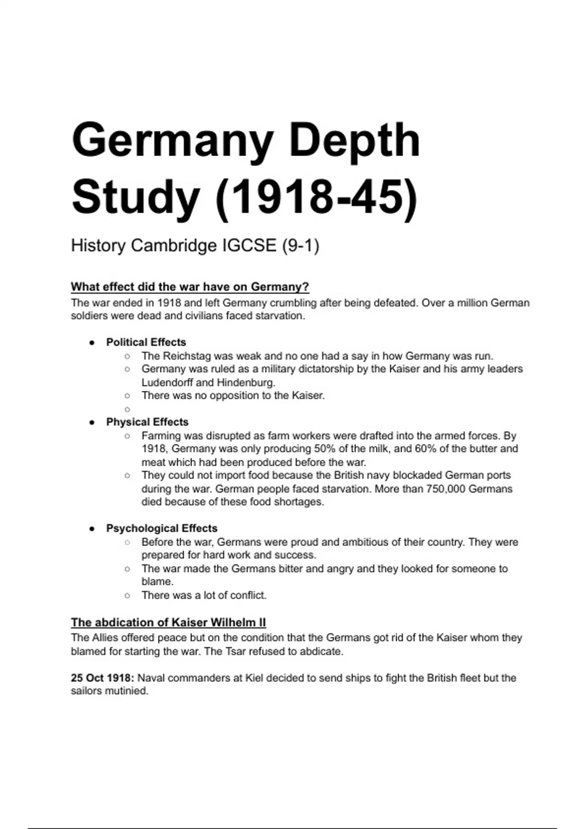 CIE IGCSE History Germany Depth Study summary notes with questions as subheadings. Covers: 1. Effect of war on Germany 2. Abdication of Kaiser Wilhelm II 3. Spartacist uprising 4. Treaty of Versailles 5. Kapp Putsch 6. Weimar Constitution 7. Invasion of the Ruhr 8. Hyperinflation