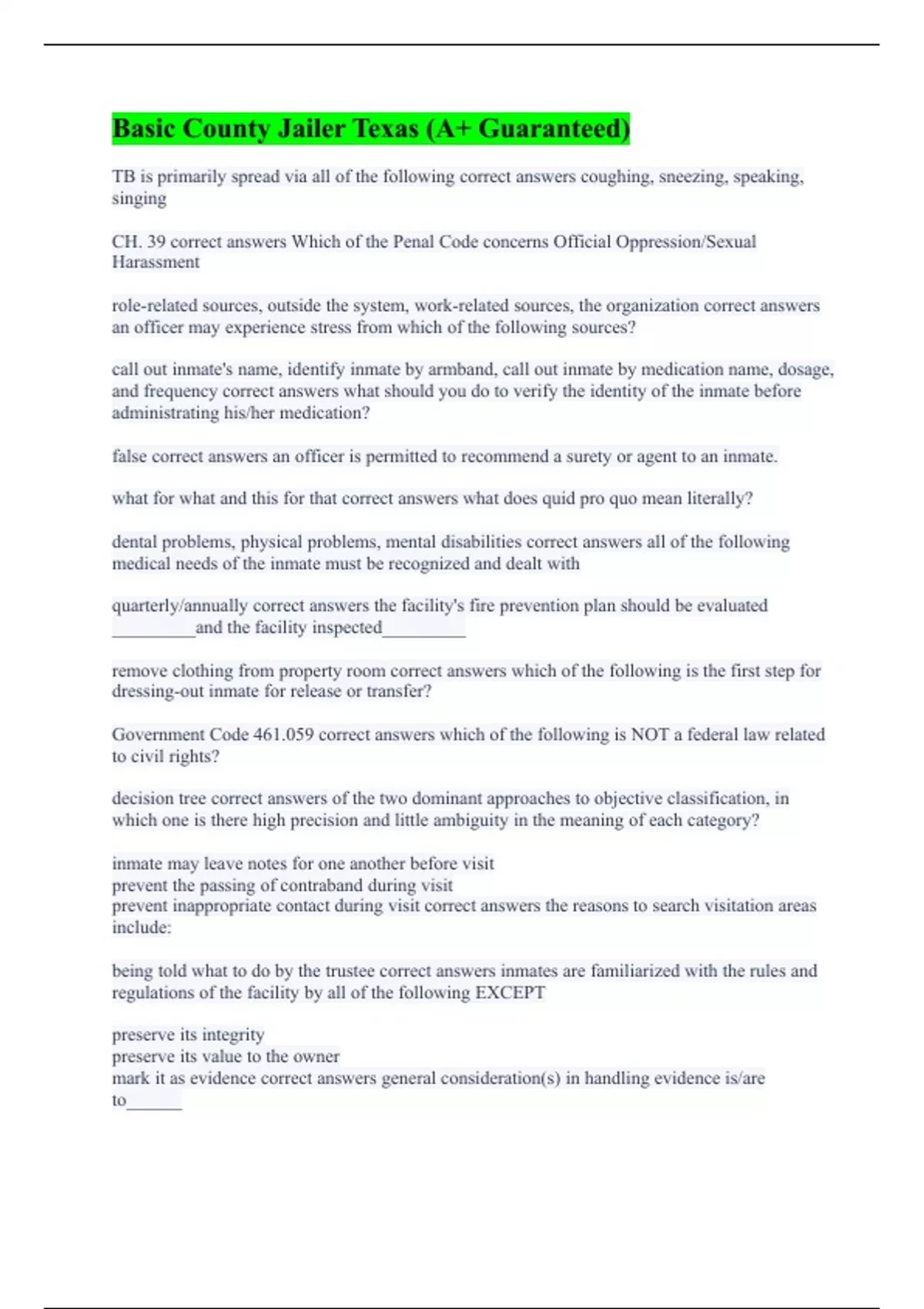 TB is primarily spread via all of the following correct answers coughing, sneezing, speaking, singing CH. 39 correct answers Which of the Penal Code concerns Official Oppression/Sexual Harassment role-related sources, outside the system, work-related sources, the organization correct answers an officer may experience stress from which of the following sources? call out inmate's name, identify inmate by armband, call out inmate by medication name, dosage, and frequency correct answers what should you do to verify the identity of the inmate before administrating his/her medication? false correct answers an officer is permitted to recommend a surety or agent to an inmate. what for what and this for that correct answers what does quid pro quo mean literally? dental problems, physical problems, mental disabilities correct answers all of the following medical needs of the inmate must be recognized and dealt with quarterly/annually correct answers the facility's fire prevention plan should be evaluated _________and the facility inspected_________ remove clothing from property room correct answers which of the following is the first step for dressing-out inmate for release or transfer? Government Code 461.059 correct answers which of the following is NOT a federal law related to civil rights? decision tree correct answers of the two dominant approaches to objective classification, in which one is there high precision and little ambiguity in the meaning of each category? inmate may leave notes for one another before visit prevent the passing of contraband during visit prevent inappropriate contact during visit correct answers the reasons to search visitation areas include: being told what to do by the trustee correct answers inmates are familiarized with the rules and regulations of the facility by all of the following EXCEPT preserve its integrity preserve its value to the owner mark it as evidence correct answers general consideration(s) in handling evidence is/are to______