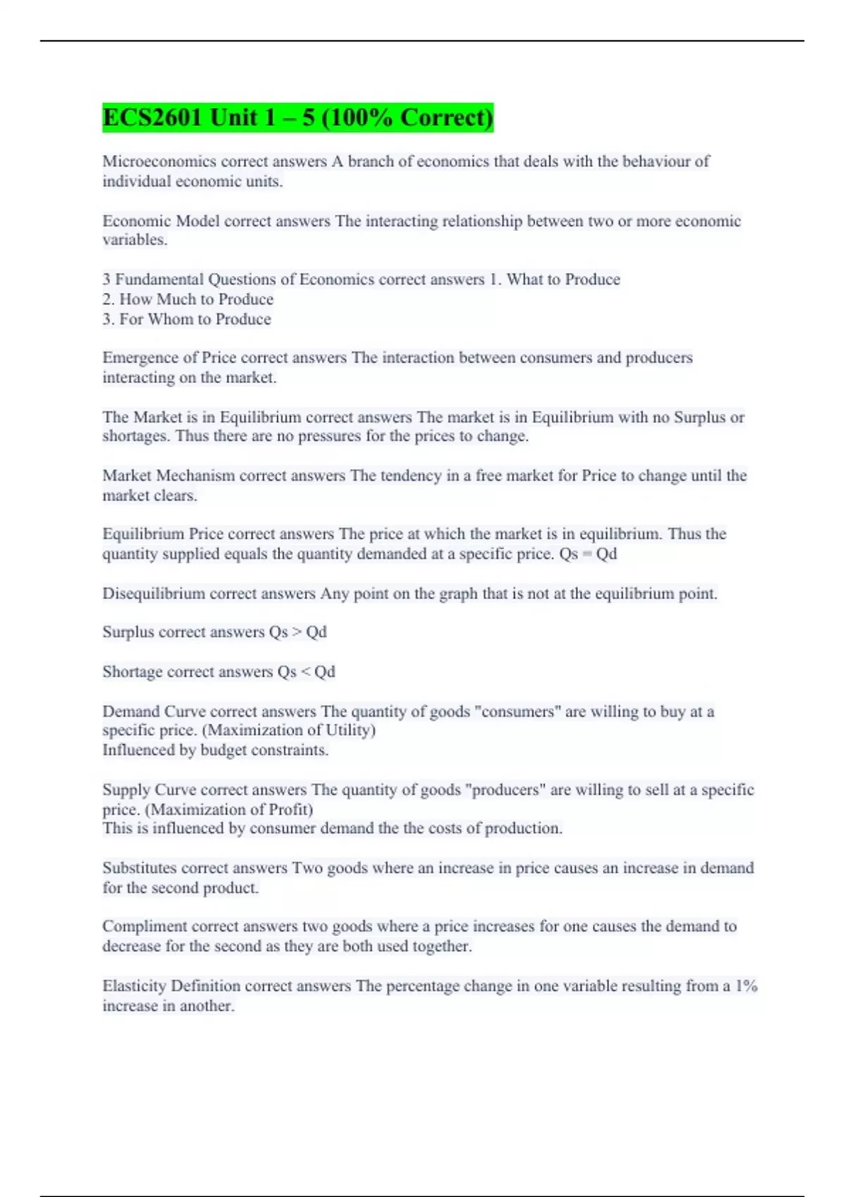 Microeconomics correct answers A branch of economics that deals with the behaviour of individual economic units. Economic Model correct answers The interacting relationship between two or more economic variables. 3 Fundamental Questions of Economics correct answers 1. What to Produce 2. How Much to Produce 3. For Whom to Produce Emergence of Price correct answers The interaction between consumers and producers interacting on the market. The Market is in Equilibrium correct answers The market is in Equilibrium with no Surplus or shortages. Thus there are no pressures for the prices to change. Market Mechanism correct answers The tendency in a free market for Price to change until the market clears. Equilibrium Price correct answers The price at which the market is in equilibrium. Thus the quantity supplied equals the quantity demanded at a specific price. Qs = Qd Disequilibrium correct answers Any point on the graph that is not at the equilibrium point. Surplus correct answers Qs > Qd Shortage correct answers Qs < Qd Demand Curve correct answers The quantity of goods "consumers" are willing to buy at a specific price. (Maximization of Utility) Influenced by budget constraints. Supply Curve correct answers The quantity of goods "producers" are willing to sell at a specific price. (Maximization of Profit) This is influenced by consumer demand the the costs of production. Substitutes correct answers Two goods where an increase in price causes an increase in demand for the second product. Compliment correct answers two goods where a price increases for one causes the demand to decrease for the second as they are both used together. Elasticity Definition correct answers The percentage change in one variable resulting from a 1% increase in another.