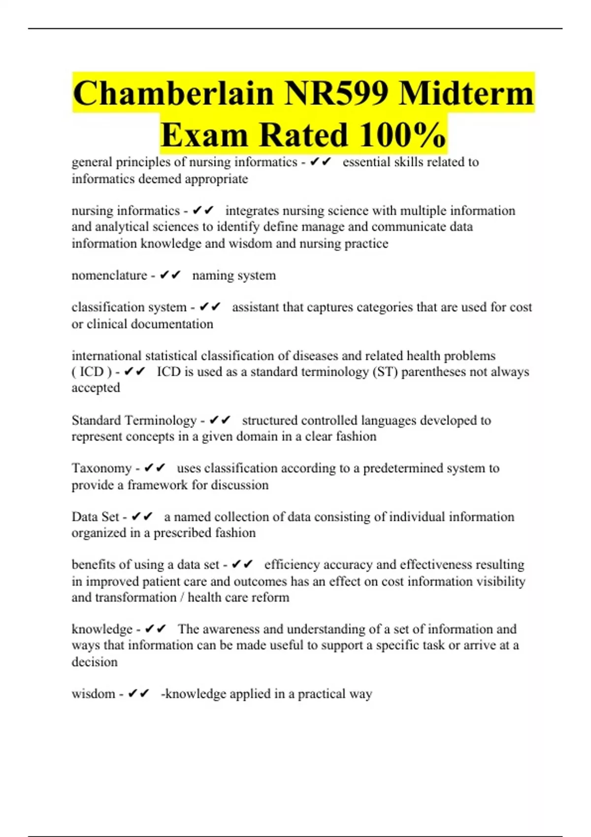 general principles of nursing informatics - essential skills related to informatics deemed appropriate nursing informatics - integrates nursing science with multiple information and analytical sciences to identify define manage and communicate data information knowledge and wisdom and nursing practice nomenclature - naming system classification system - assistant that captures categories that are used for cost or clinical documentation international statistical classification of diseases and related health problems ( ICD ) - ICD is used as a standard terminology (ST) parentheses not always accepted Standard Terminology - structured controlled languages developed to represent concepts in a given domain in a clear fashion Taxonomy - uses classification according to a predetermined system to provide a framework for discussion Data Set - a named collection of data consisting of individual information organized in a prescribed fashion benefits of using a data set - efficiency accuracy and effectiveness resulting in improved patient care and outcomes has an effect on cost information visibility and transformation / health care reform knowledge - The awareness and understanding of a set of information and ways that information can be made useful to support a specific task or arrive at a decision wisdom - -knowledge applied in a practical way -the highest form of common sense -entails knowing when and how to apply knowledge -It is through efforts to understand the nature of knowledge in its evolution that one can conceive of build and implement informatics tools to enhance and mimic the mind's processes to facilitate decision-making and job performance scientific underpinning - The foundation of nursing science through research data evidence and idea creation The foundation of knowledge model - A model proposing that humans are organic information systems constantly acquiring, processing, generating, and disseminating information or knowledge in both their professional and personal lives