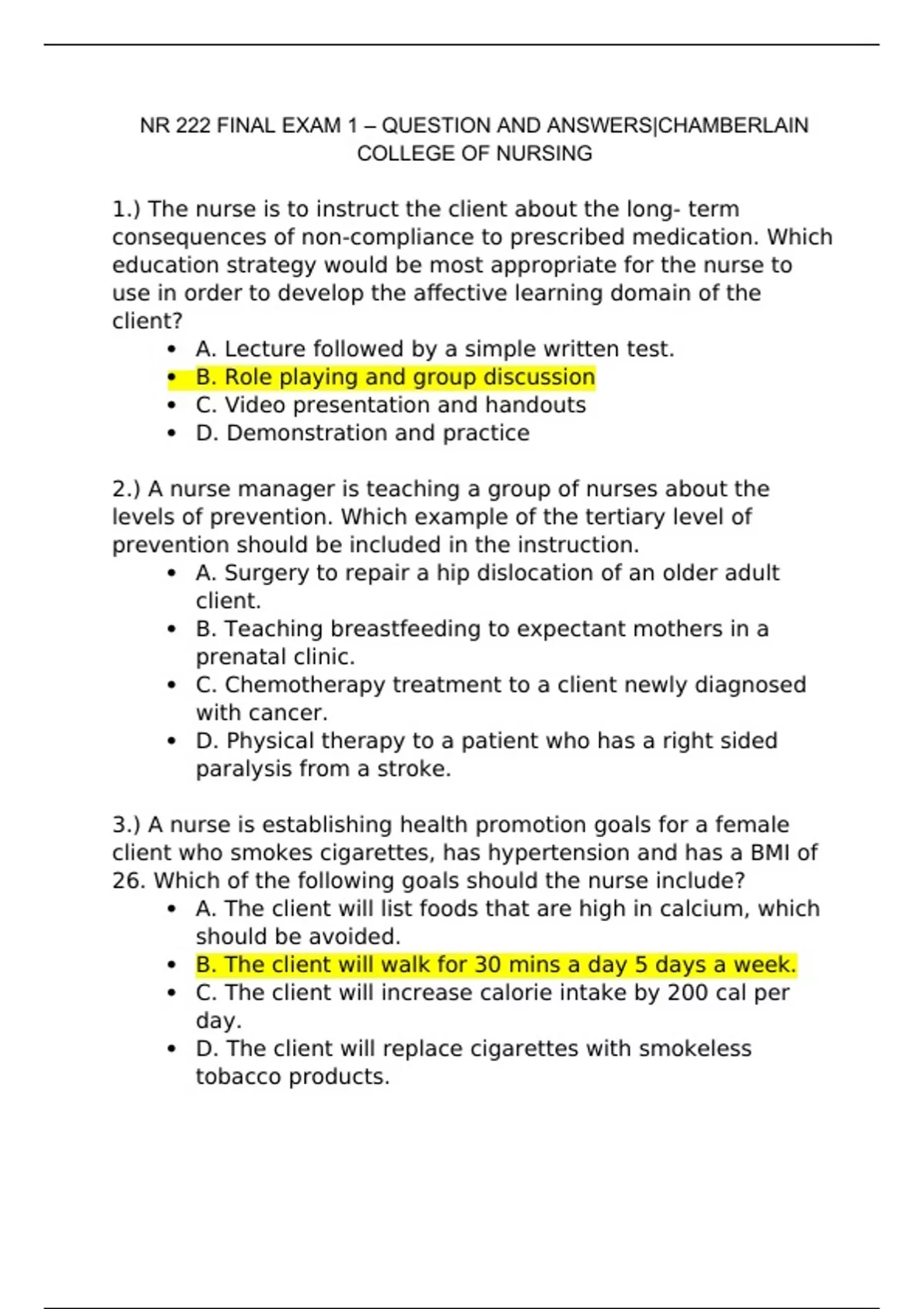 NR 222 FINAL EXAM 1 – QUESTION AND ANSWERS|CHAMBERLAIN COLLEGE OF NURSING